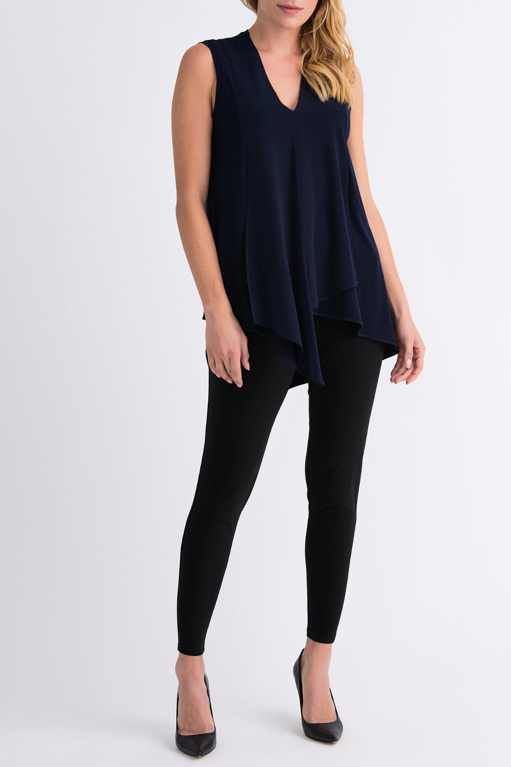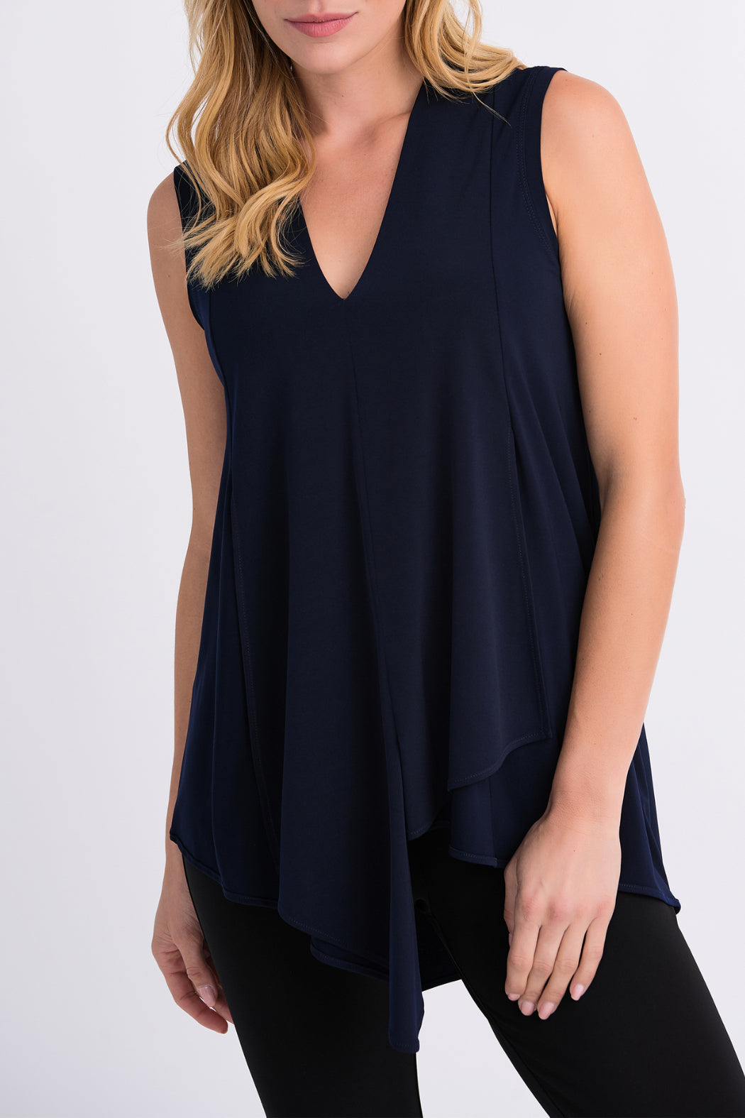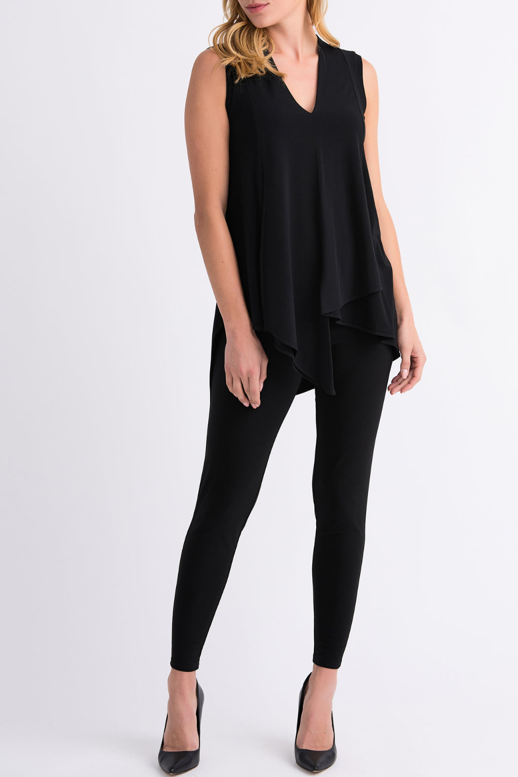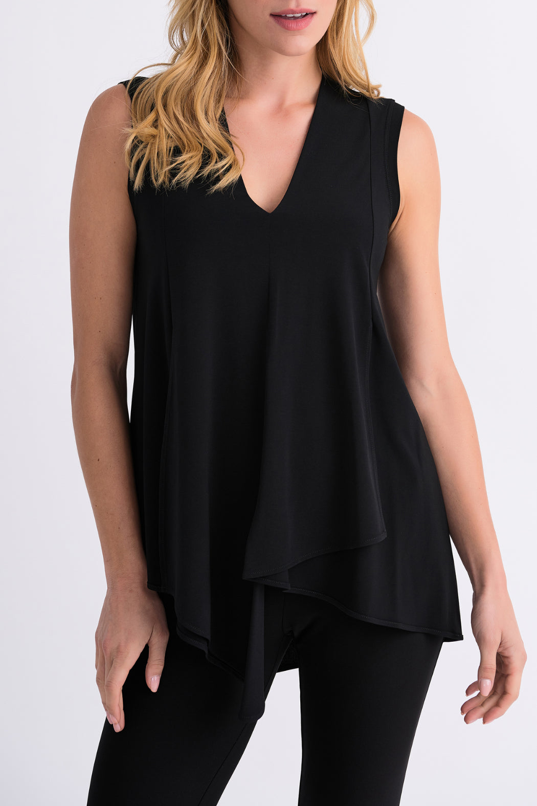 Joseph Ribkoff's sleeveless tunic comes in a loose fit with a v-neck and wrap-style handkerchief hemline for a fun look and more movement. This tunic comes unlined in black and is made of soft polyester.