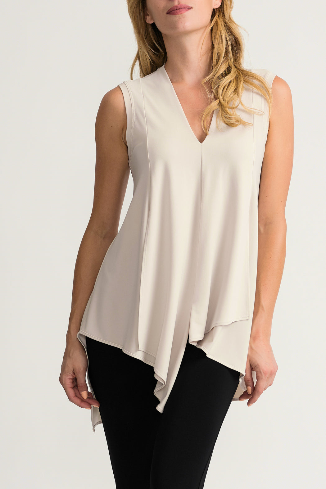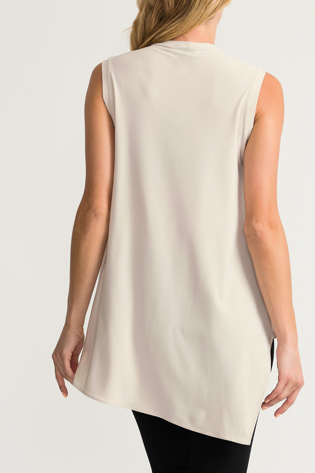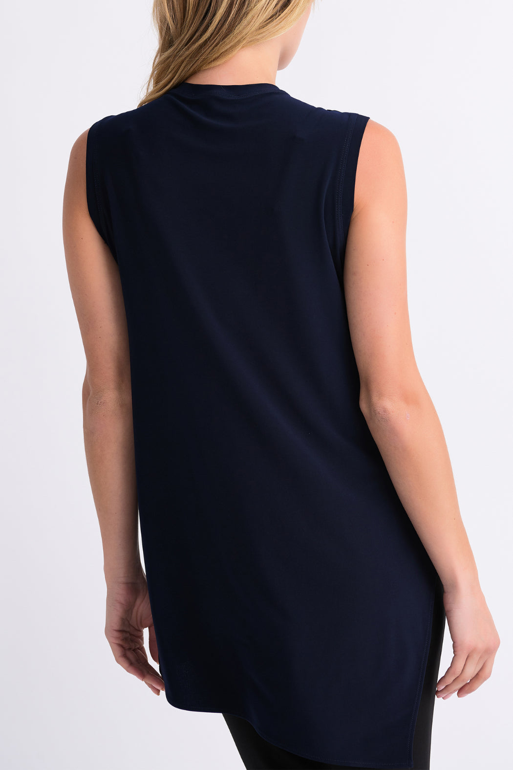 Joseph Ribkoff's sleeveless tunic comes in a loose fit with a v-neck and wrap-style handkerchief hemline for a fun look and more movement. This tunic comes unlined in black and is made of soft polyester.