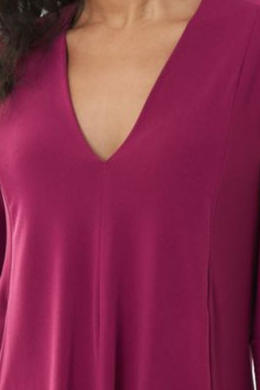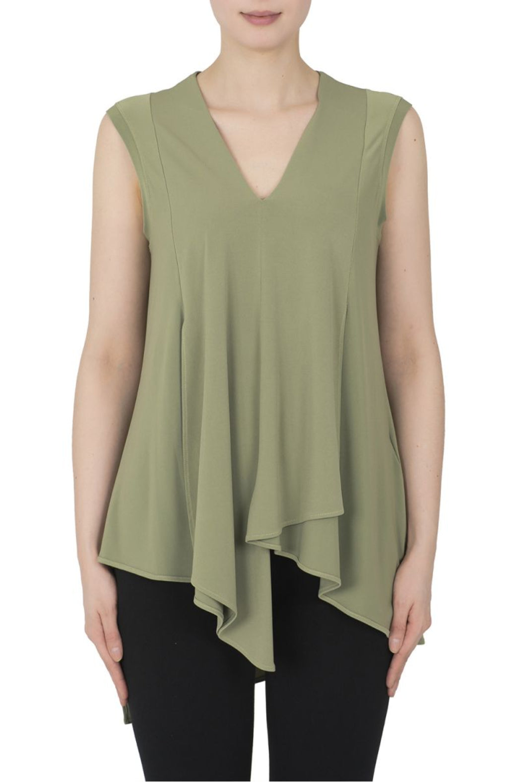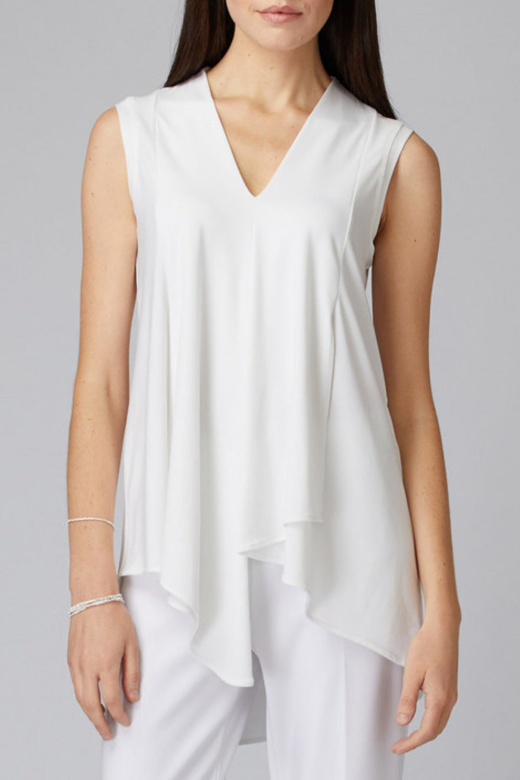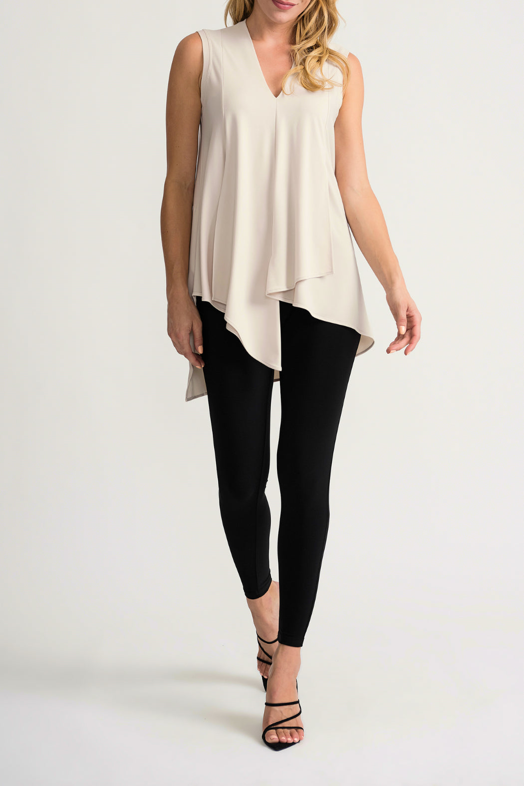 Joseph Ribkoff's sleeveless tunic comes in a loose fit with a v-neck and wrap-style handkerchief hemline for a fun look and more movement. This tunic comes unlined in black and is made of soft polyester.