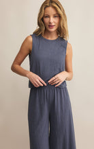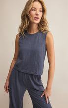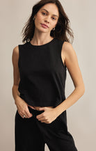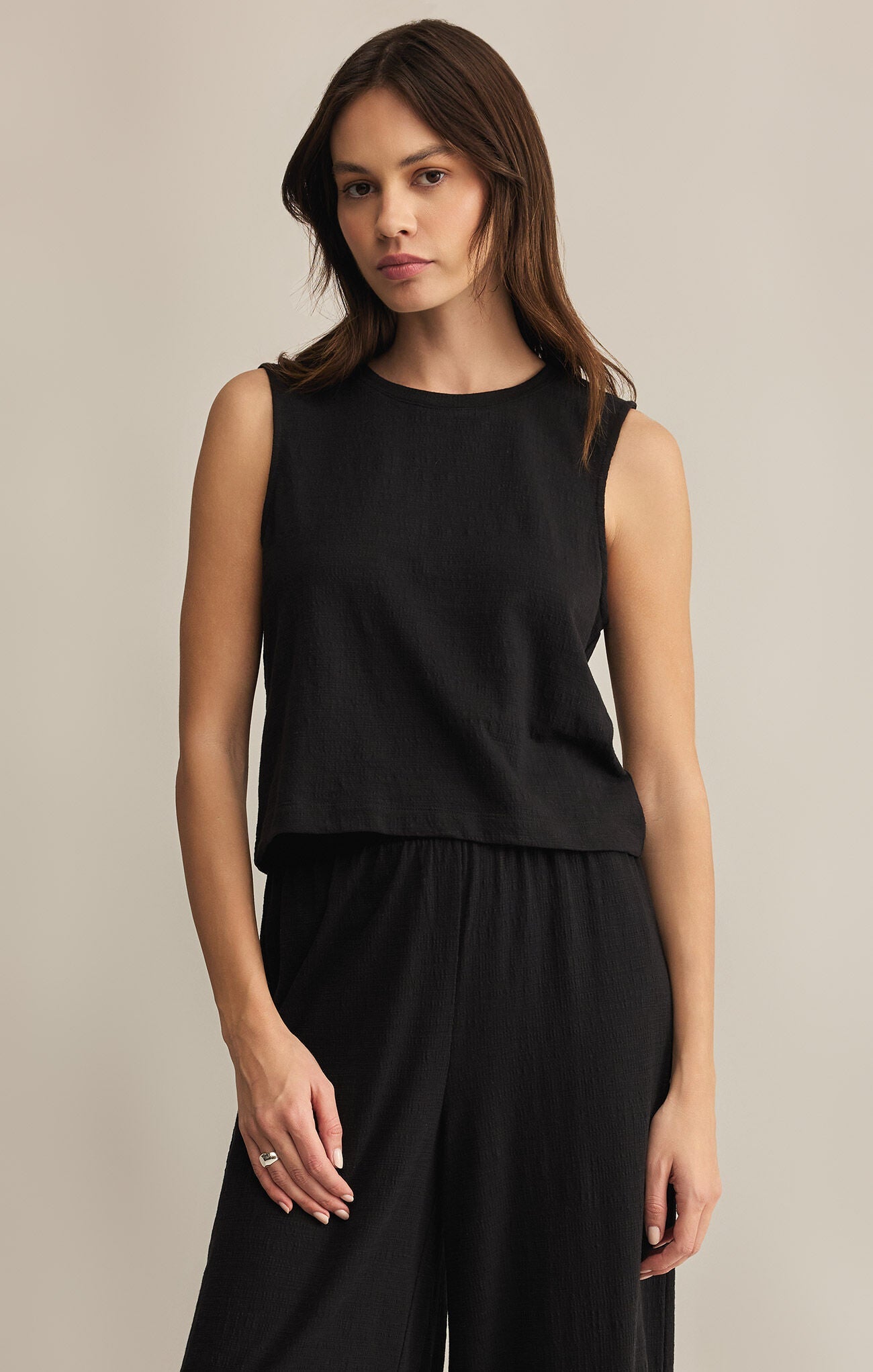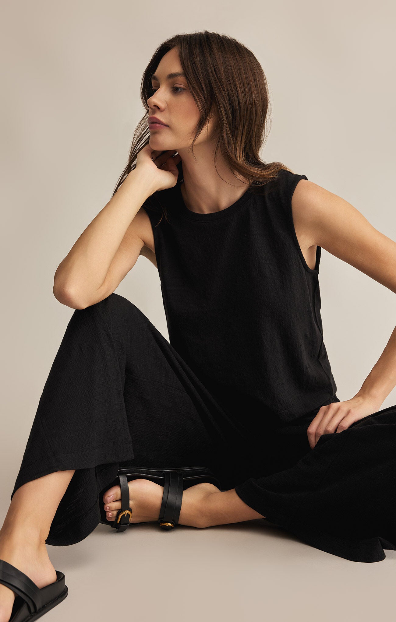 A laid-back essential with a textured twist, this sleeveless crewneck top hits at the waist and channels effortless cool. Its slub knit fabric and muscle tank style make it the perfect pairing for high-waisted denim or layered looks.