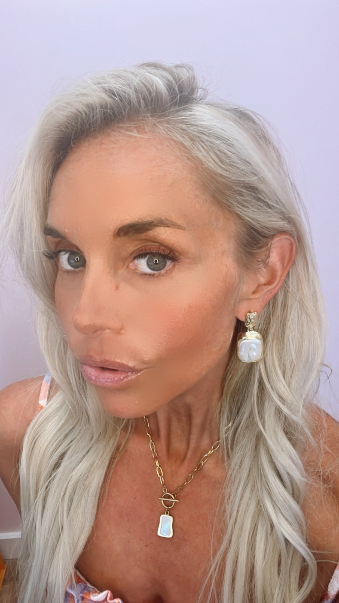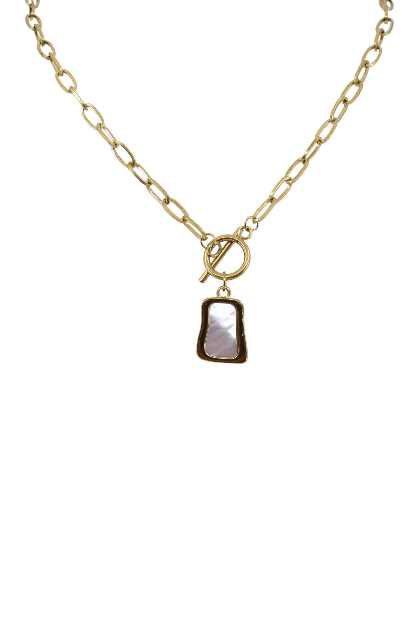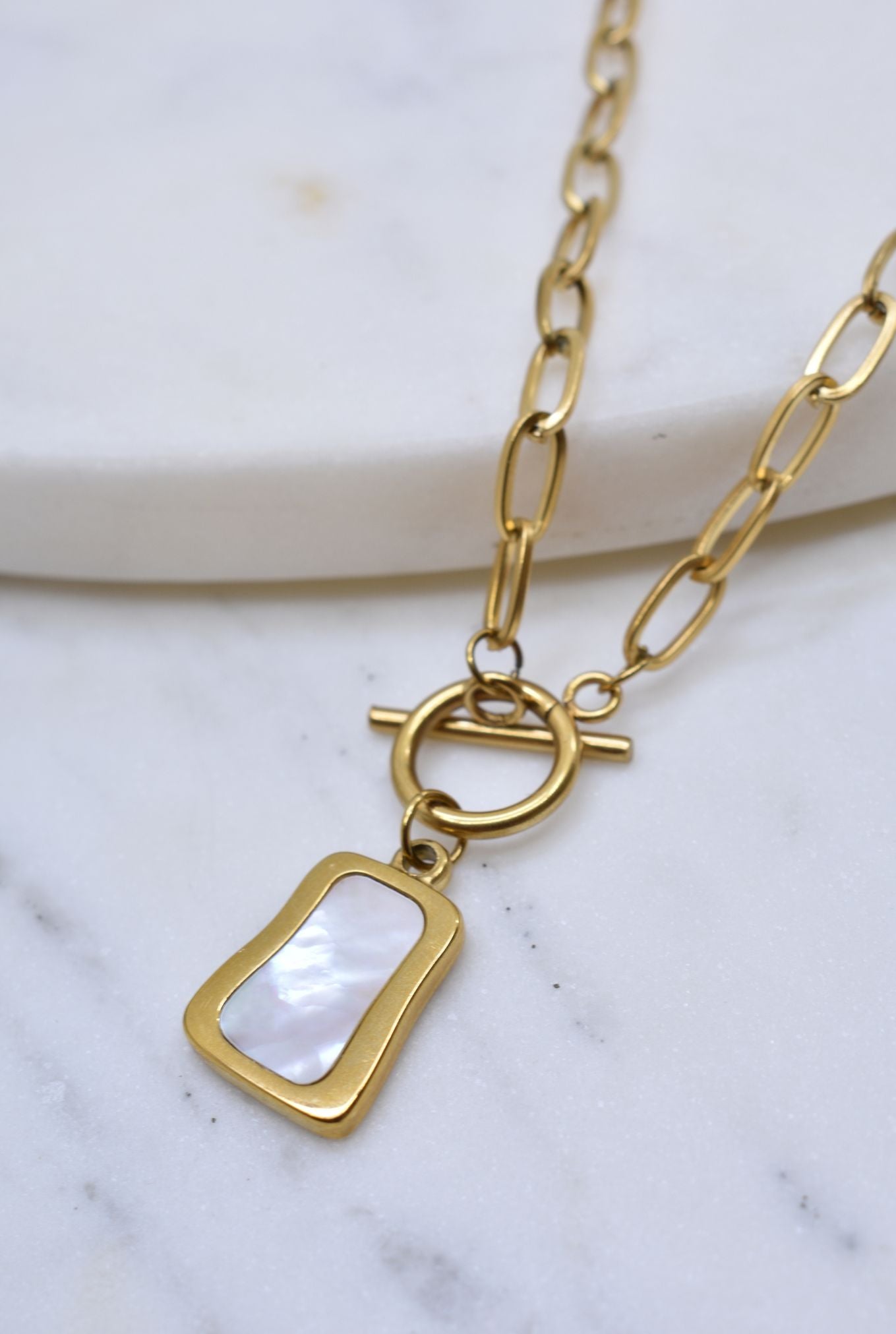 An elegant gold chain necklace with a lariat style pearl pendant. This necklace can be extended, with a lobster clasp in the back.