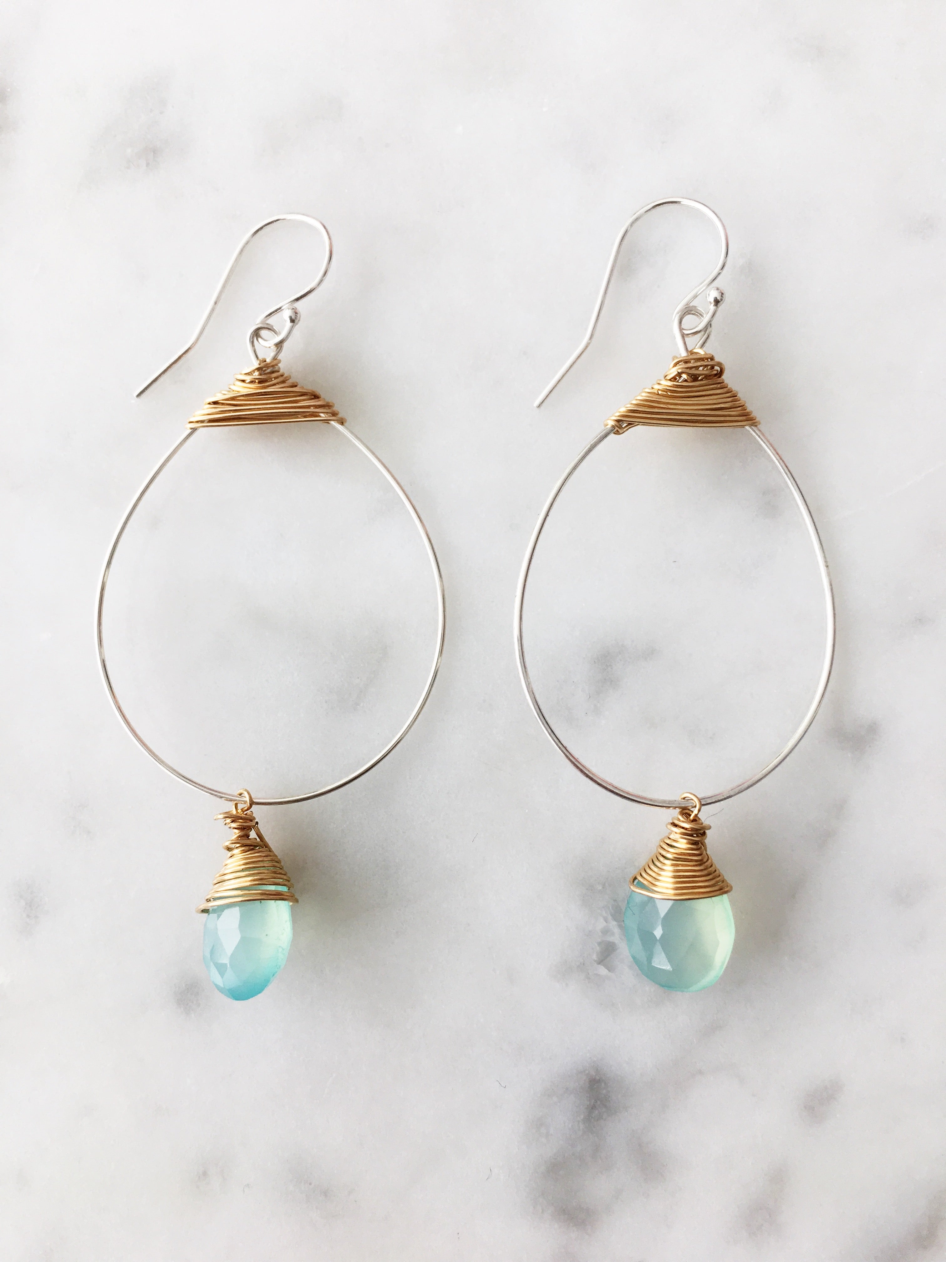 Dangle earring with silver hoop with gold wire wrap and a 14k gold fill wire wrapped chalcedony stone drop. These earrings are light as a feather.