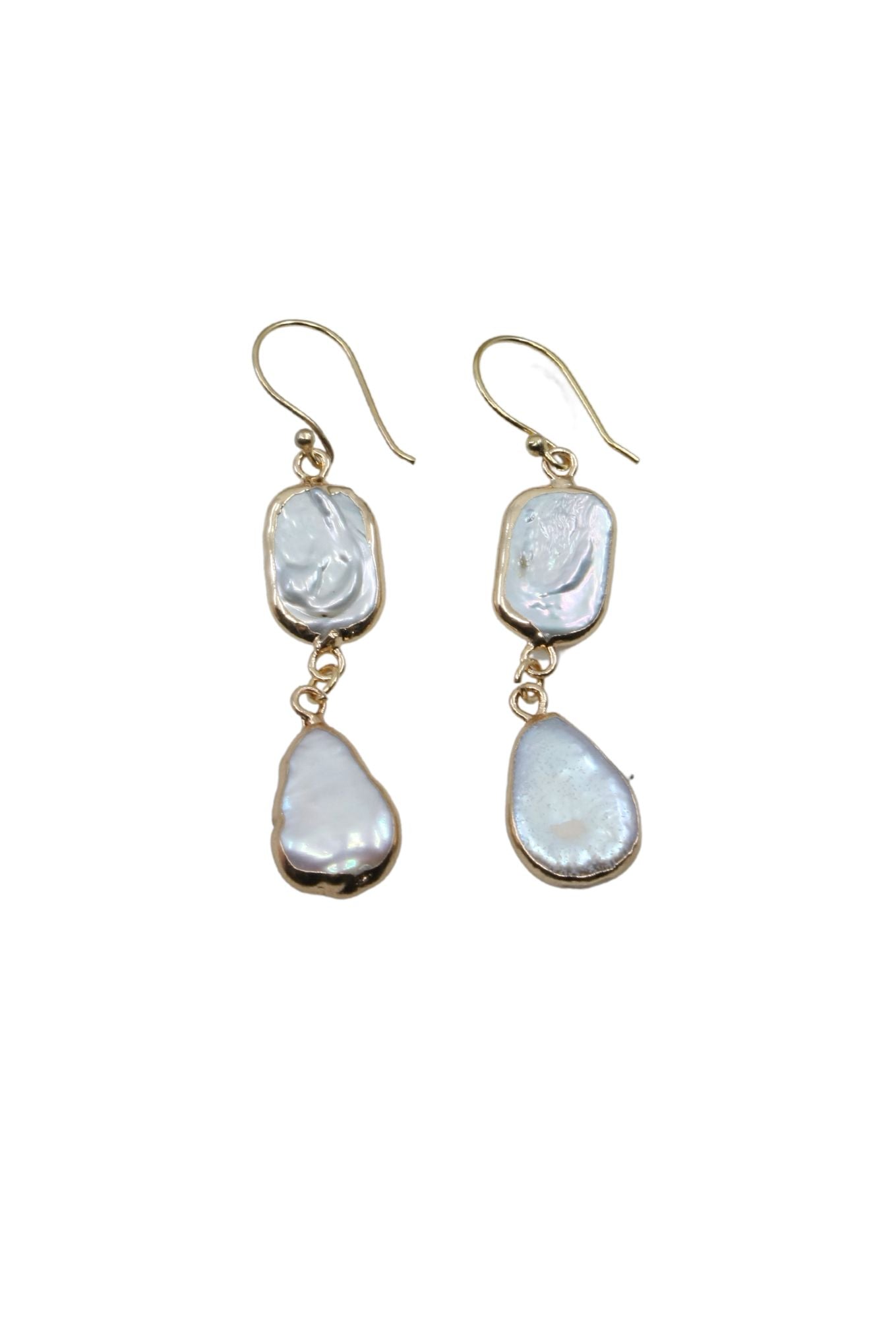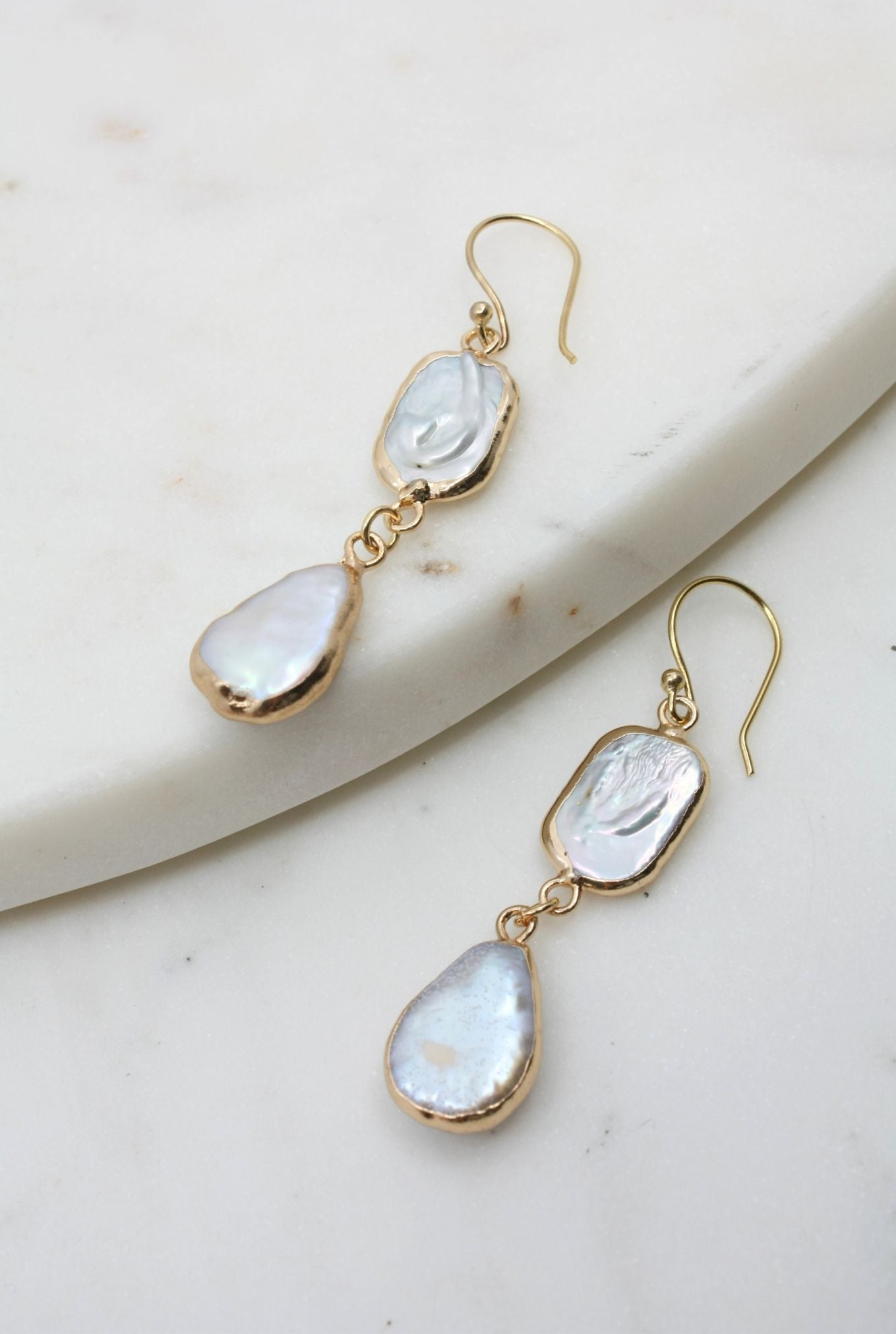 Gold dangle earrings with freshwater pearl drops. These will vary slightly due to the individual nature of the pearls which are natural and unique.