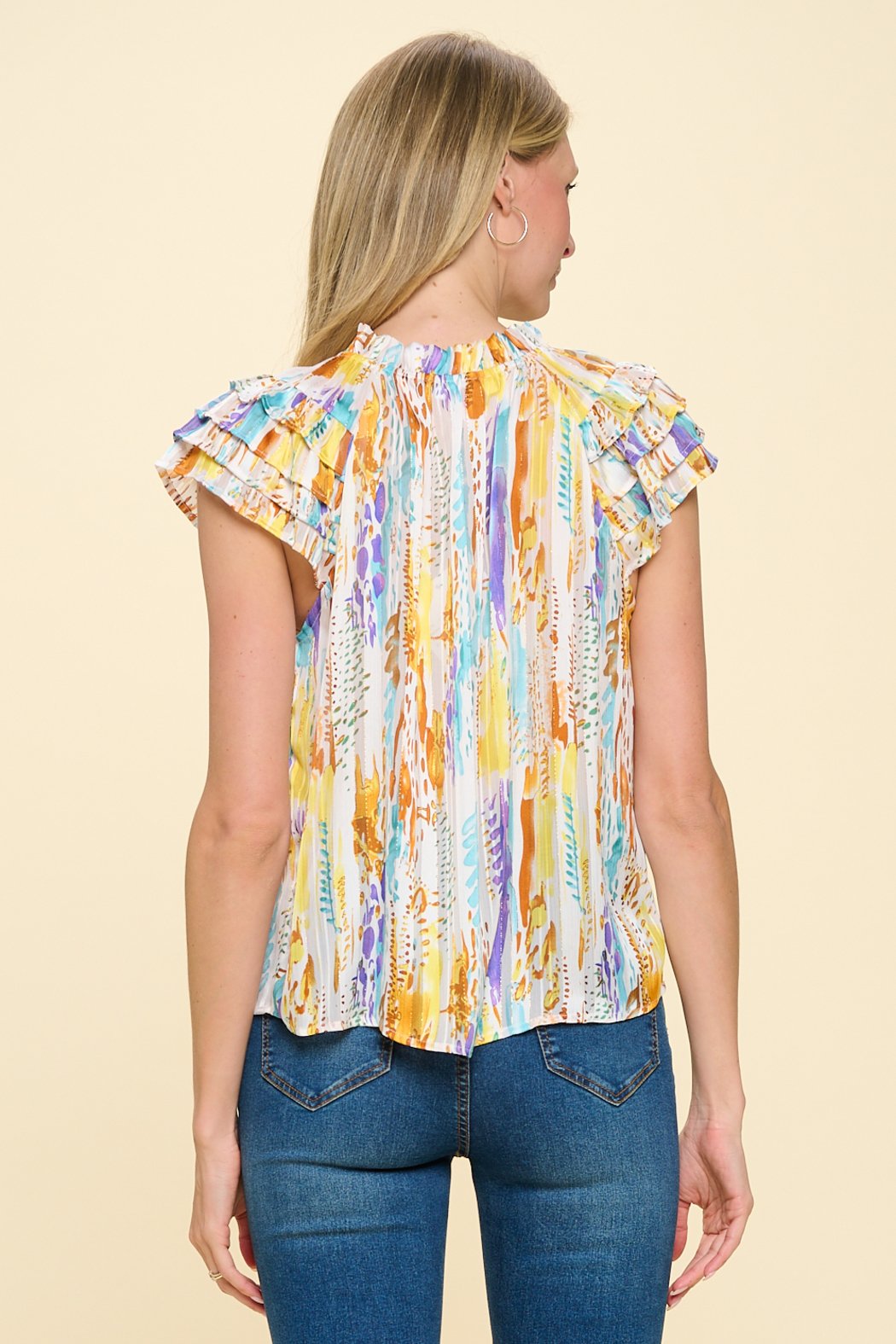 This lightweight, airy blouse features playful ruffle sleeves and a chic keyhole neckline, perfect for both casual and dressy occasions. The vibrant abstract print blends beautiful shades of orange, purple, and blue, creating a dynamic look that easily pairs with jeans or trousers. Made from breathable fabric, this top is designed to keep you stylish and comfortable all day long. The loose fit provides effortless elegance and the perfect transition from day to night wear.