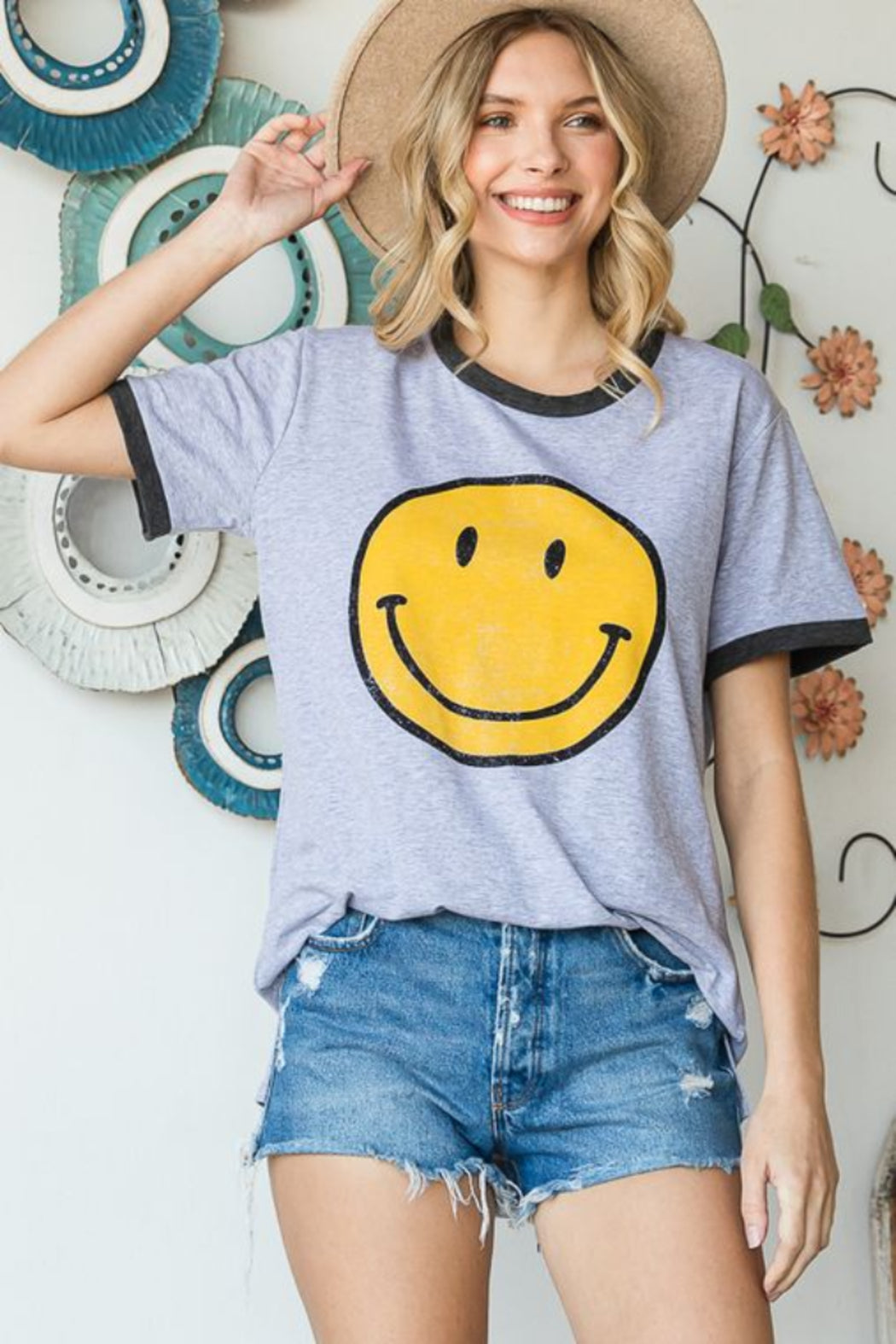 Welcome the warm weather with our Smiley Face graphic tee! Available in heather gray color, loose style with side slits on bottom hem, contrasted dark color of the scoop neckline and the short sleeves hem, front yellow colored graphic print, material has stretch. Match it with almost anything for a fun casual style!
