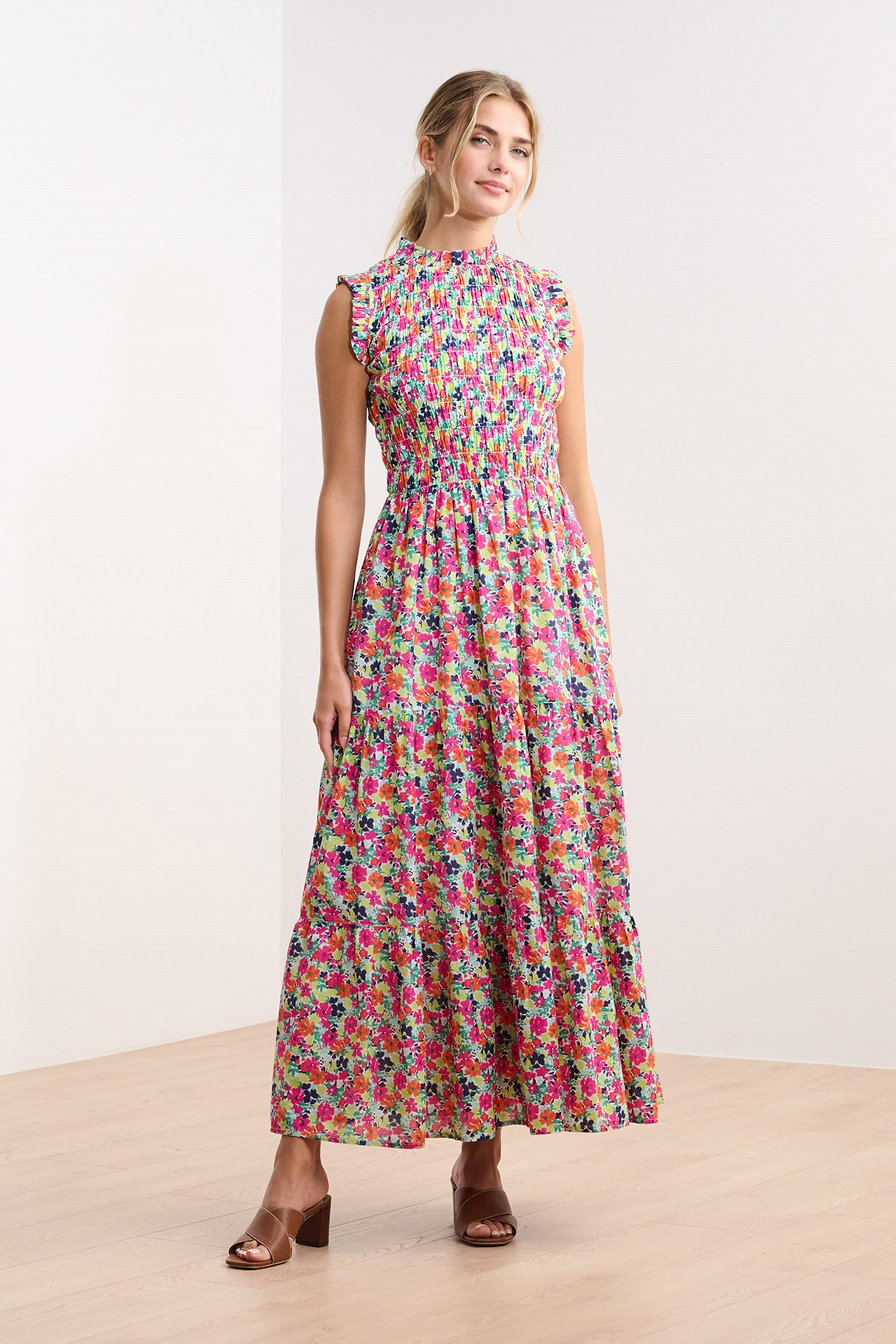 The Smocked Maxi Dress in Fresh Flowers is an elegant yet comfortable fully-lined option for special occasions. Made from a blend of viscose, polyester, and nylon, this fully lined dress features a smocked bodice for a flattering fit, a ruffled neckline, a three-tiered skirt, and a flowing silhouette. The playful floral design in bright tones adds a modern edge. Style it with heels or sandals for a chic, effortless outfit.