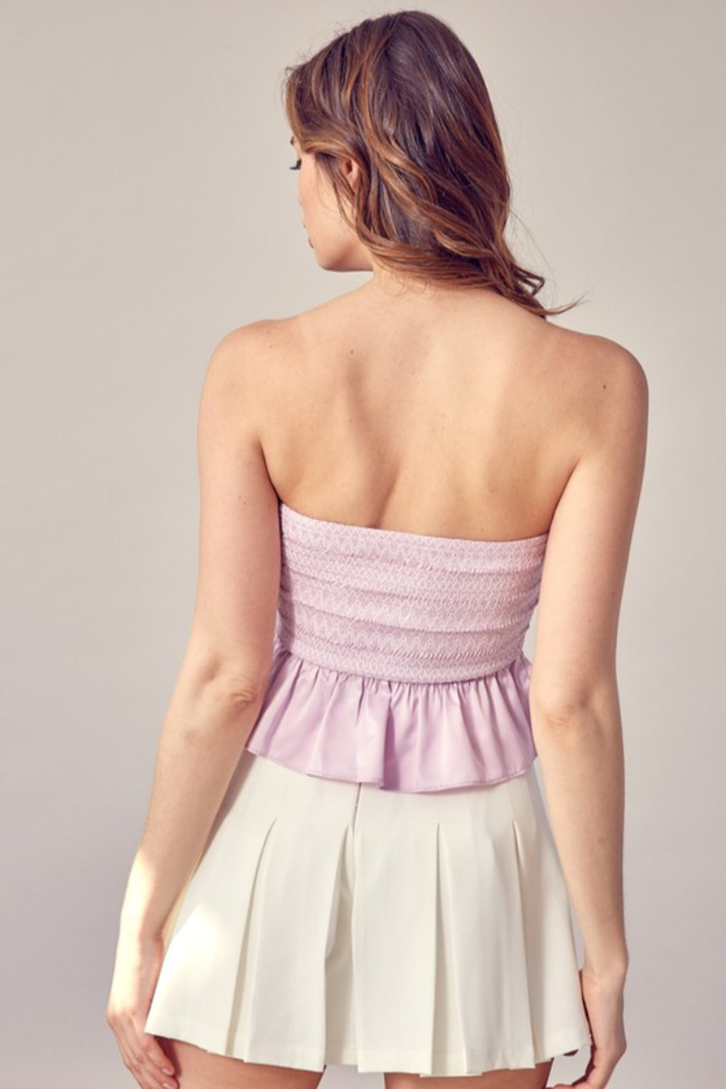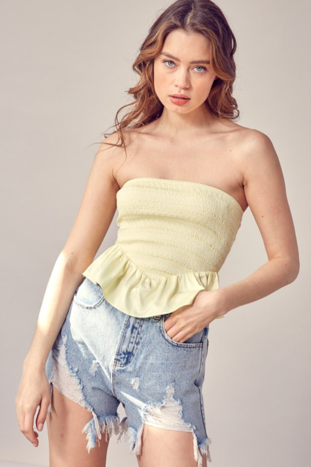 Stretchy smocked tube top with peplum. FABRIC: 94% POLYESTER 6% SPANDEX True to size Made in CHINA