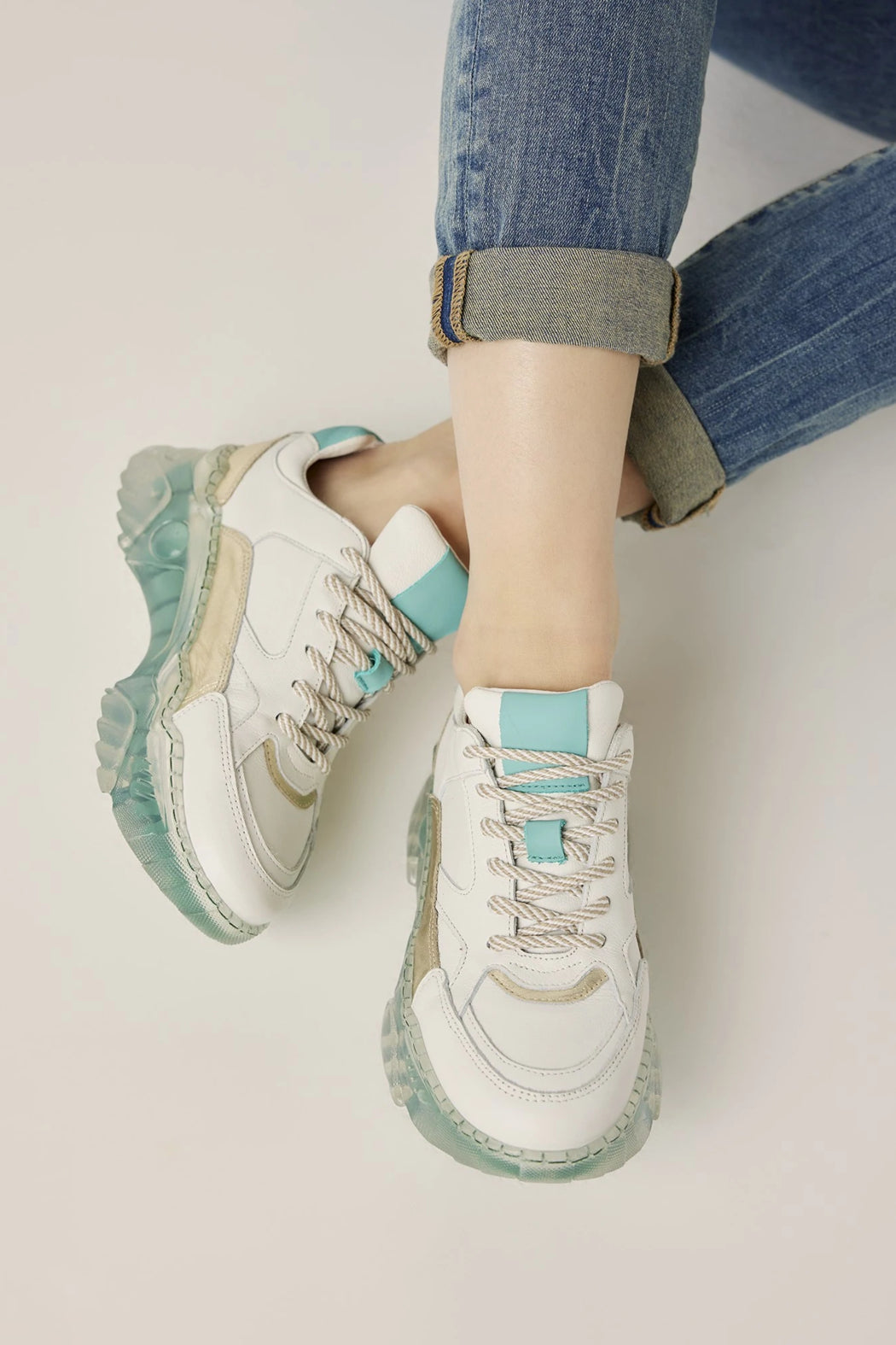Low-top sneakers with a 100% leather upper, with shoelaces and a robust, 3 cm thick sole with an extra layer of transparent material.