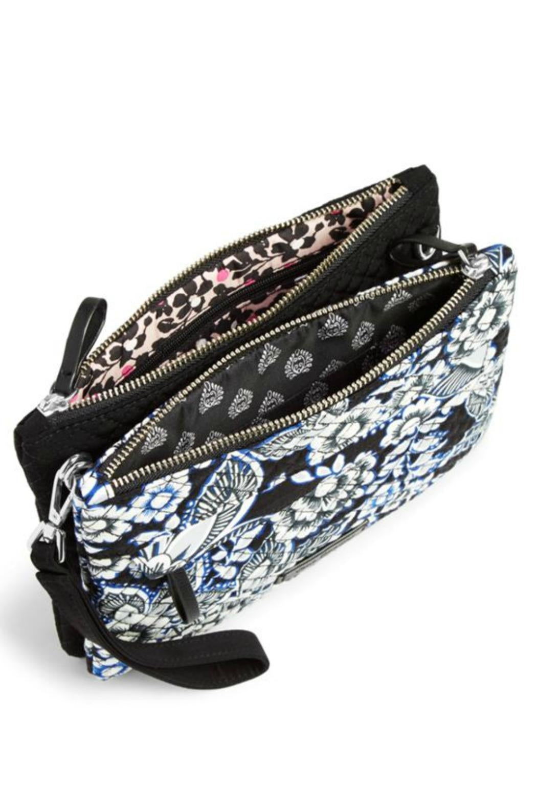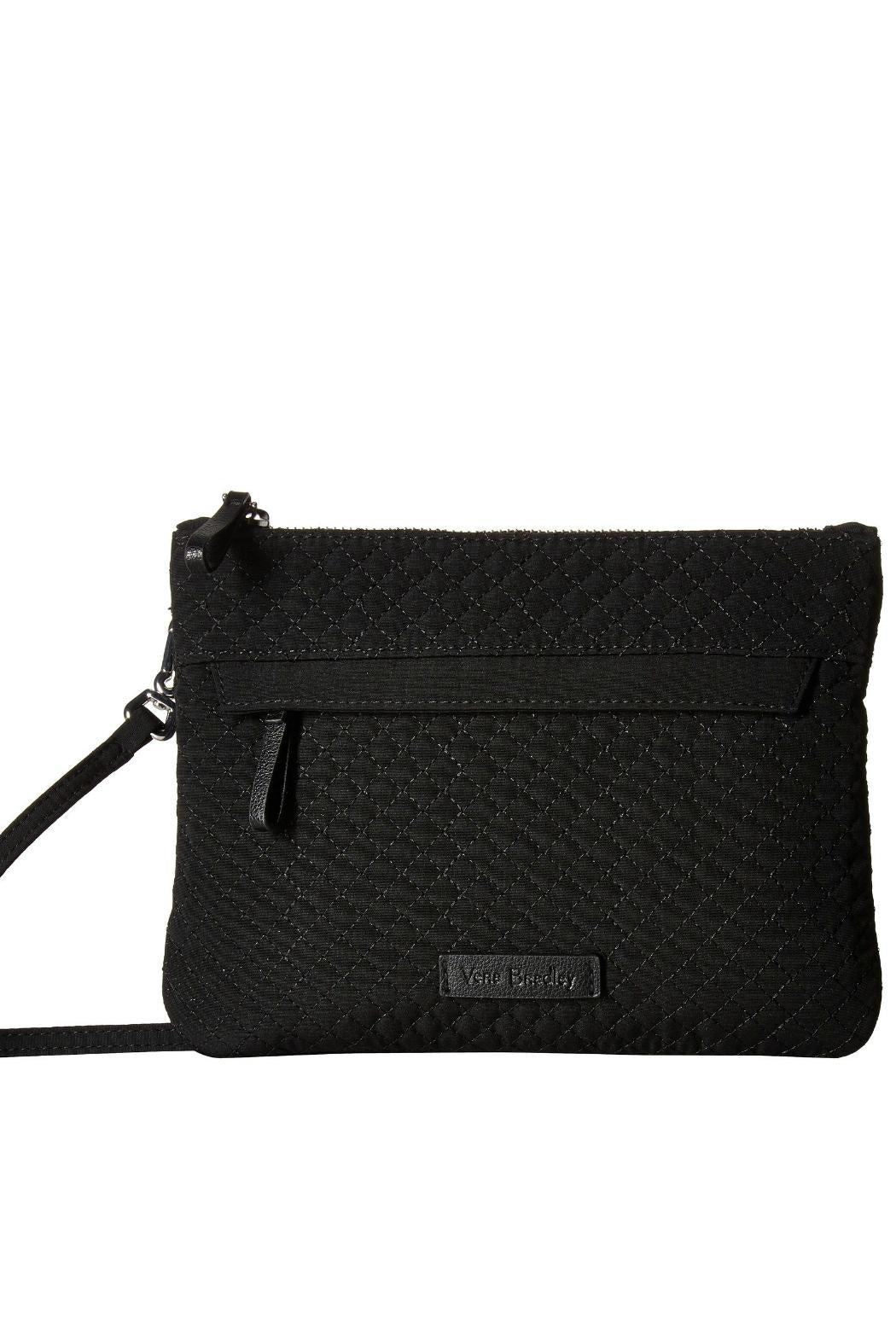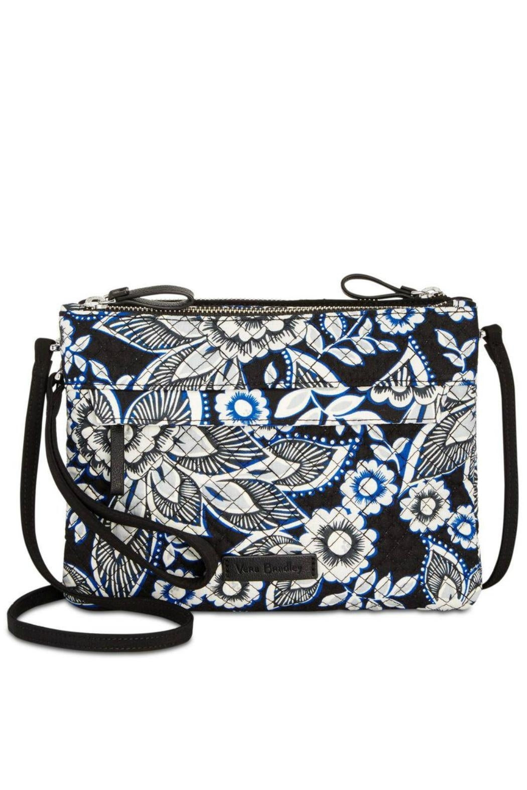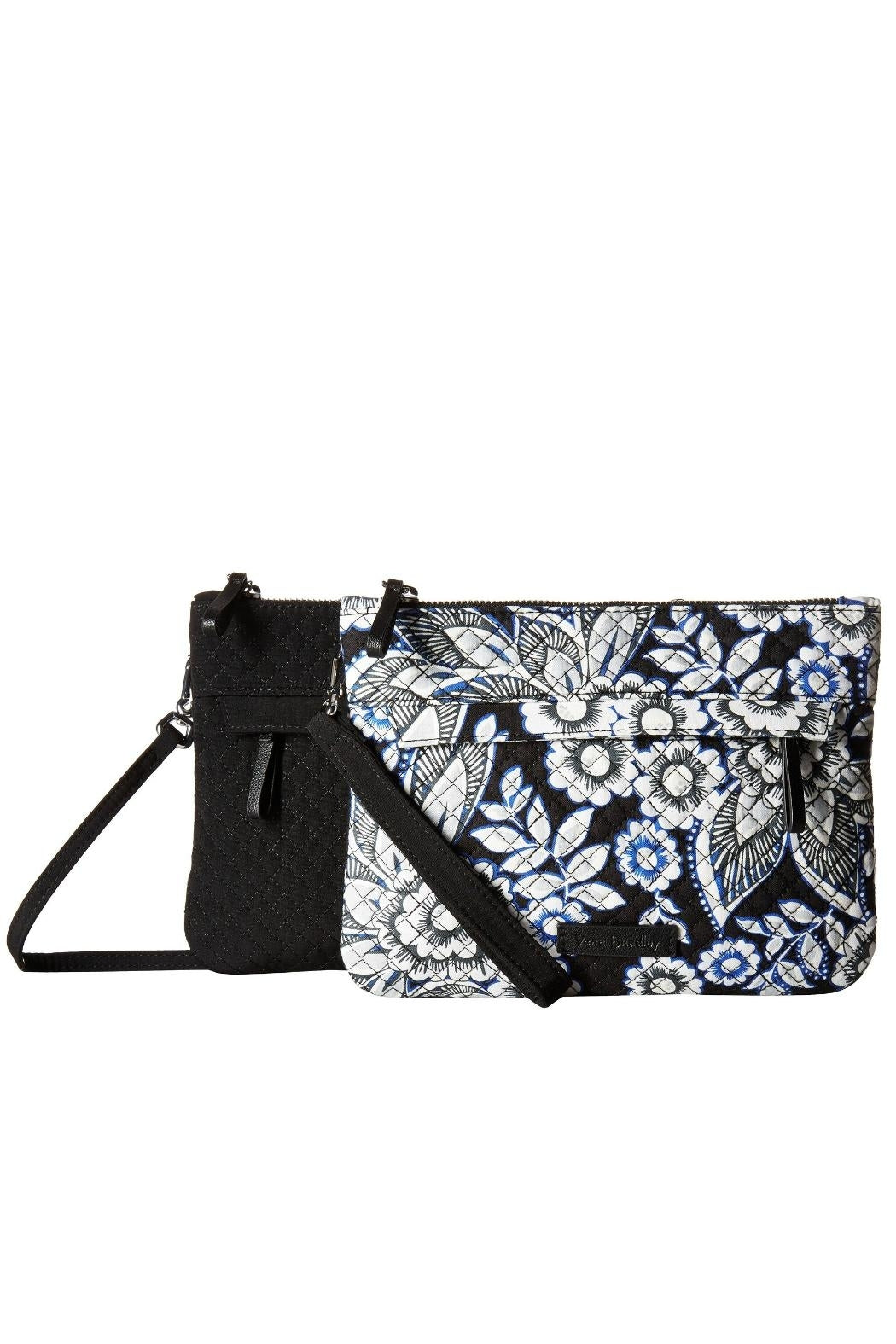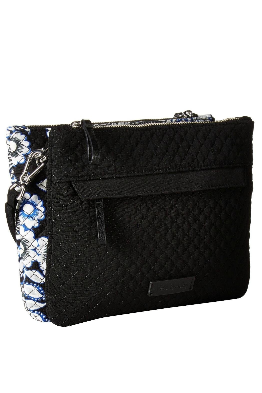 Meet the Vera Bradley® Iconic RFID Custom "Double" Crossbody in Snow Lotus and Black. Carry this versatile bag any way you can imagine. Two pouches combine magnetically to create a double-pouch crossbody, or separate them and pick one to wear as a single-pouch crossbody, a wristlet, or a clutch! Each pouch is made of mini quilted cotton. Provides RFID protection for credit and debit cards. Removable crossbody strap and wristlet strap included. Zip closures on top and sides of both bags. Exterior features a zip pocket on each. Lined interior features one zip and three card slip pockets in each. Find other Vera Bradley Snow Lotus bags and accessories on the Mimi's Gift Gallery boutique page. ------- Measurements: Bottom Width: 9 in, Depth: 1.5 in. each, Height: 6.75 in. Adjustable Strap Length: 52.5 in, Strap Drop: 25 in, Wristlet Strap 8 in.