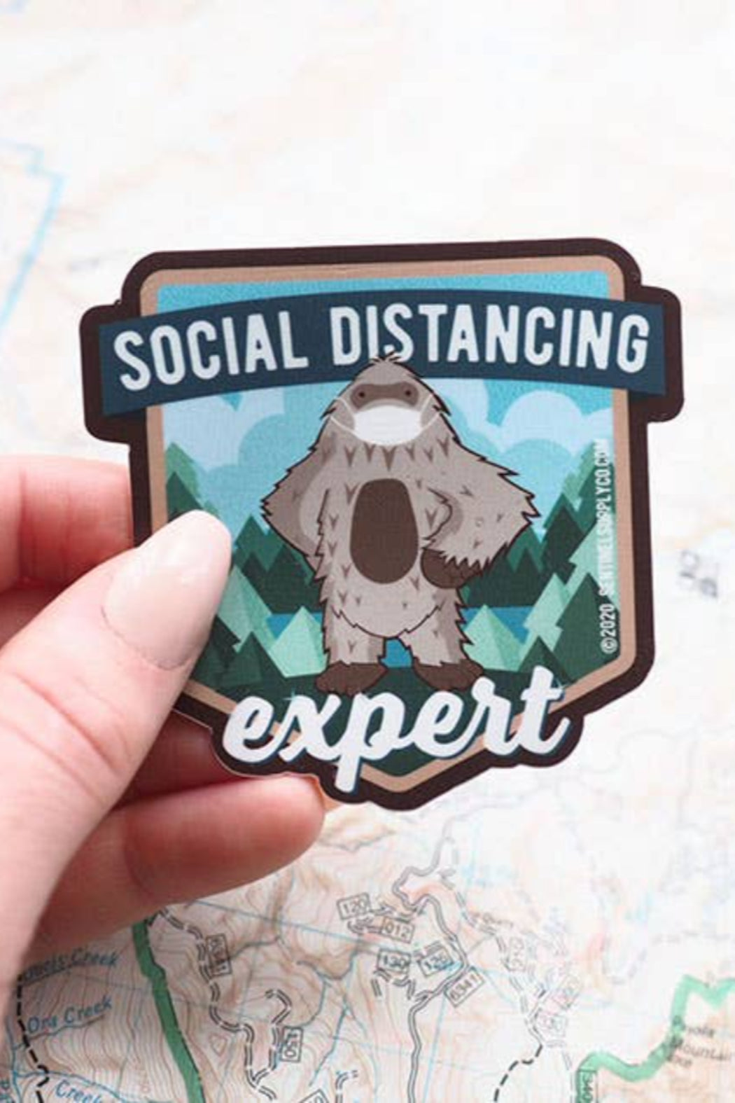 Social Distancing sasquatch sticker. 2 sizes. Nobody does coronavirus social distancing like Bigfoot! This funny sticker was made to support our local food bank while reminding people to take precautions against COVID-19. 15% of the profits from each order goes to the local food bank in our hometown of Coeur d'Alene, ID. Stick this cute Bigfoot decal on your laptop, notebook, car bumper, or travel gear. Perfect waterproof vinyl sticker for Hydroflask, cooler, or thermos. Small Dimensions: 3"x 3" (Great water bottle or laptop decal). Large Dimensions: 4"x 4" (Bumper sticker size). Die cut on high quality waterproof vinyl with a matte UV protective finish, designed to endure many years of travel and use indoors and outdoors. Made in ID.