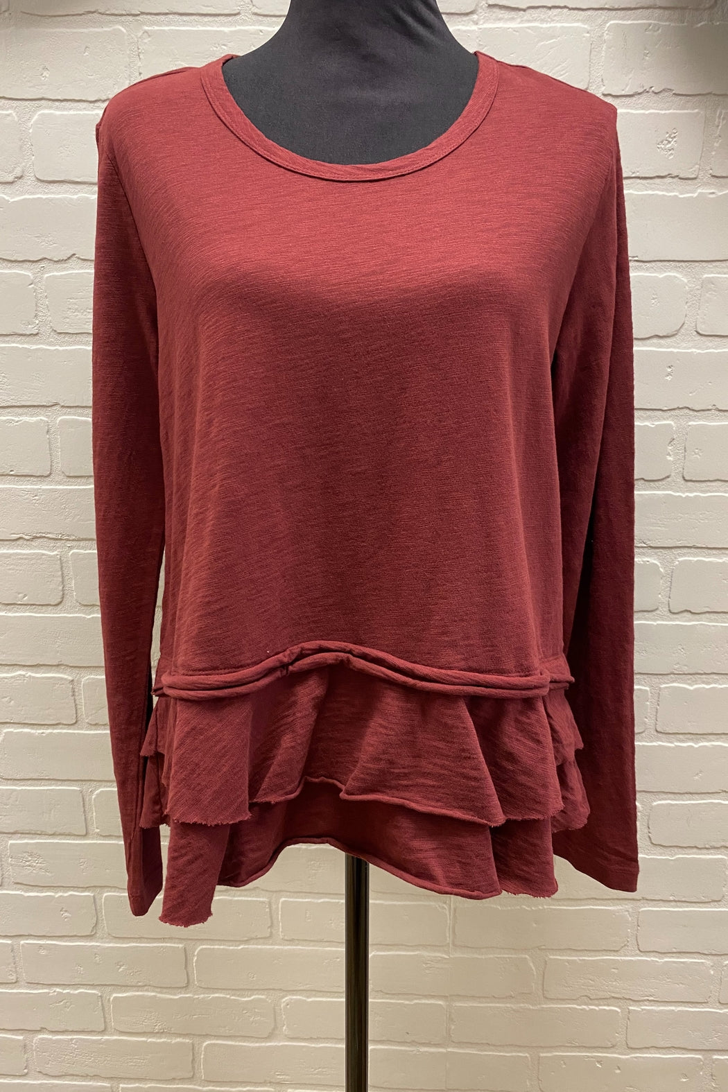 Soft slub fabric long sleeve tee with accent ruffles and raw hem