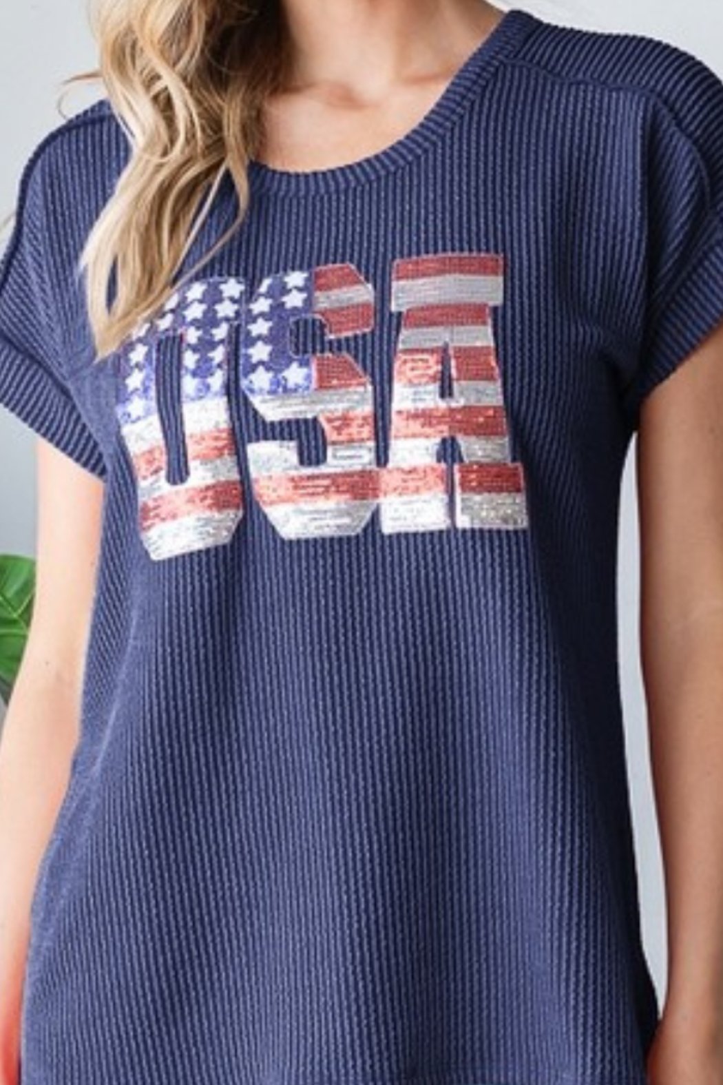 A touch of sparkle with everyday edge. This soft ribbed top feature a fitted silhouette and a bold USA sequin patch for just the right amount of shine.