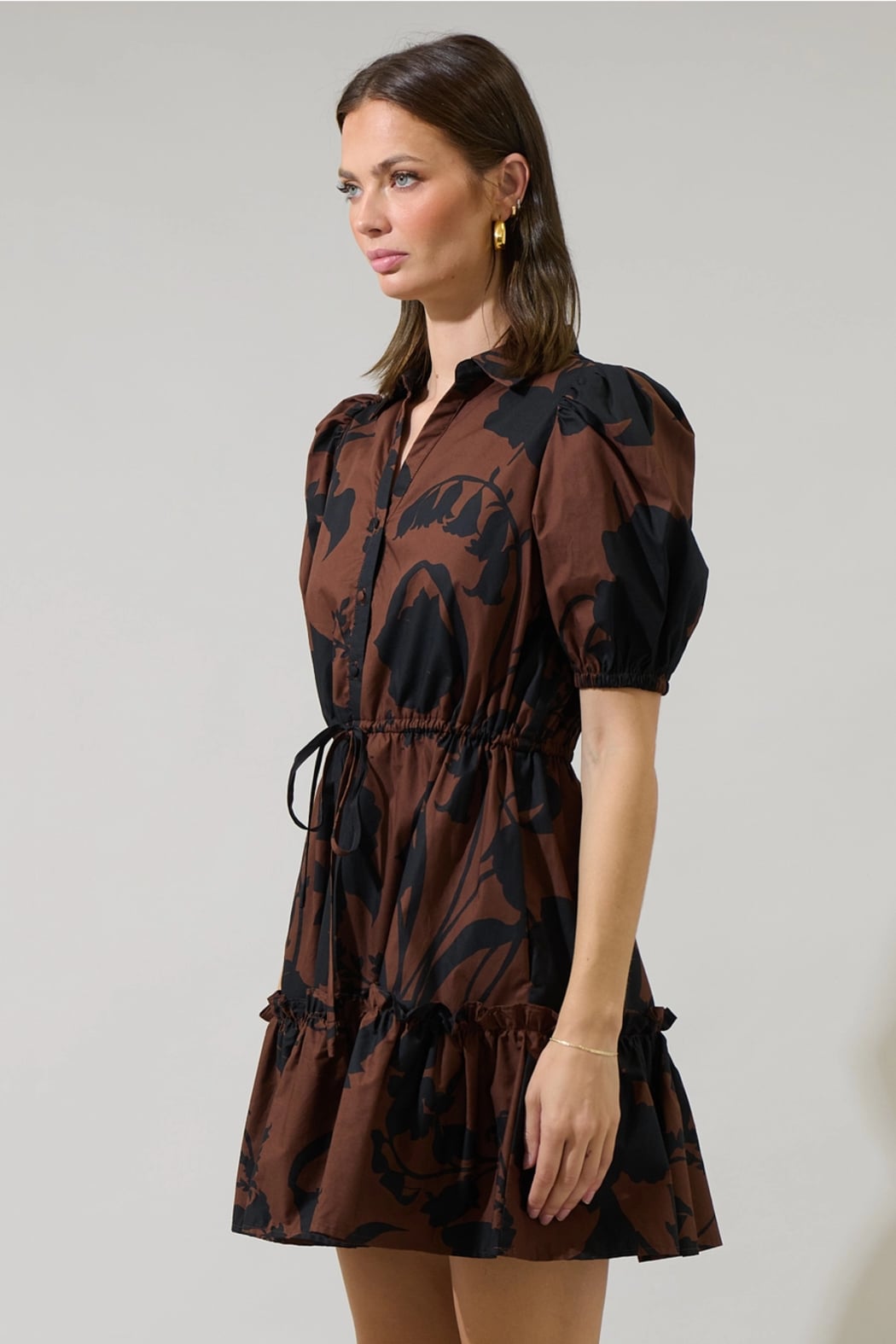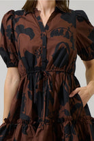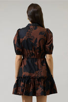 The Somerton Floral Stacie Button Down Mini Dress has a perfect combination of brown and black with florals throughout. Lightweight cotton fabric that has button down style with fitted bodice, and short half sleeves with elastic cuffs. A flirty ruffle hem finishes off the look and can be paired with heels or cute brown loafers.