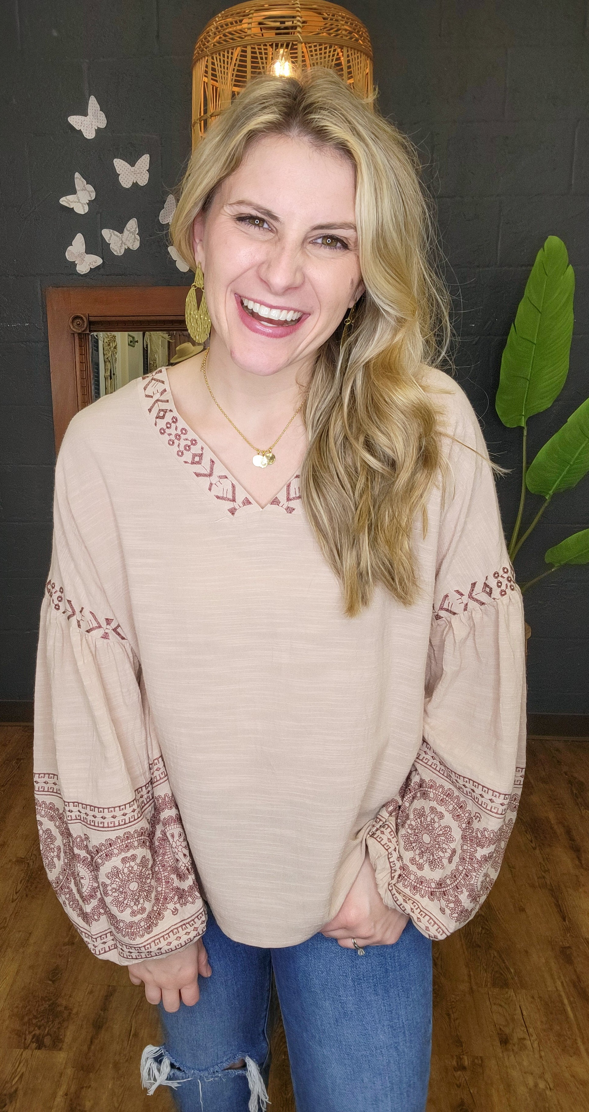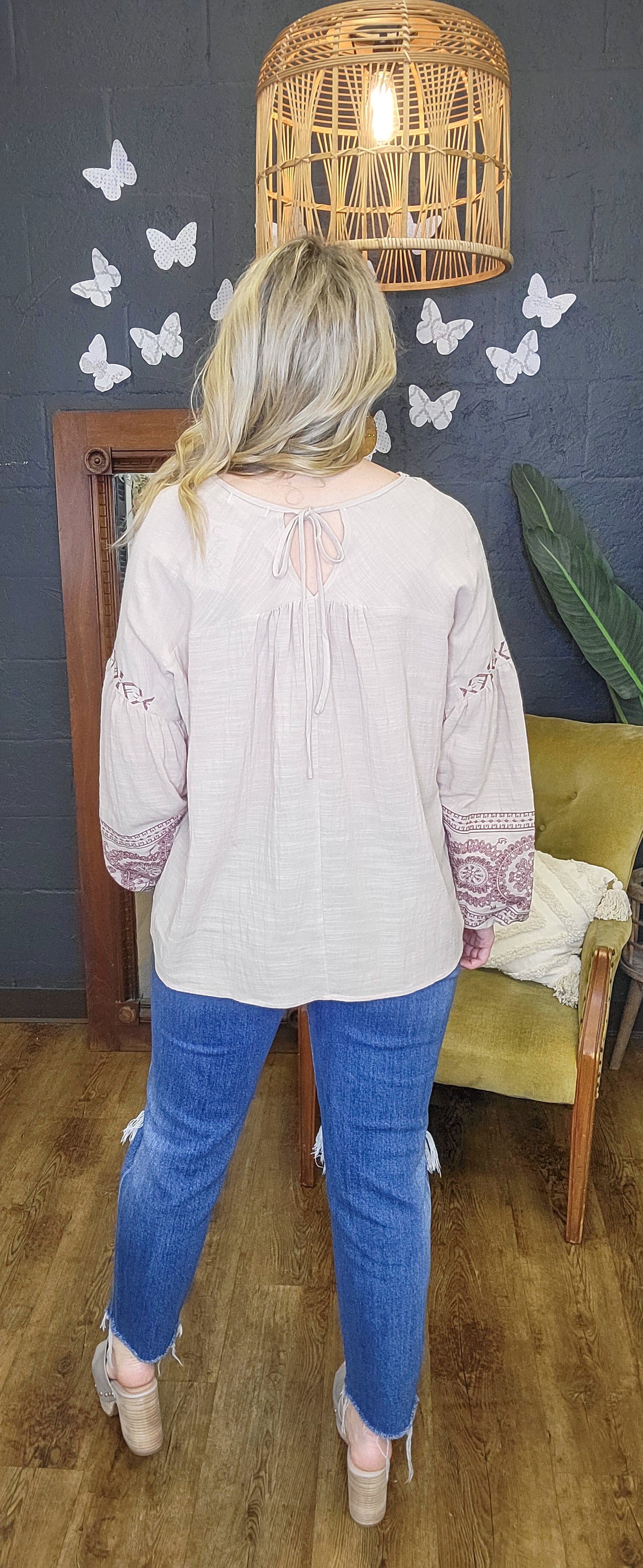 This Songbird Khaki Embroidered Top will be your go-to piece when you want to make a statement. Crafted with a classic V neckline, intricate embroidery detailing, and a flattering tie closure back, this top is sure to stand out in any wardrobe. With dropped shoulders and a loose fit, you'll look fabulous yet comfortable enough to wear all day. What are you waiting for? Get yours now!