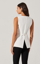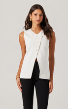 This sophisticated sleeveless dress features a sleek, tailored design with a stylish wrap front and delicate button closures. Its crisp white fabric provides a fresh, modern look, making it perfect for both professional settings and elegant outings. Pair it with tailored trousers or a chic skirt for a polished ensemble.