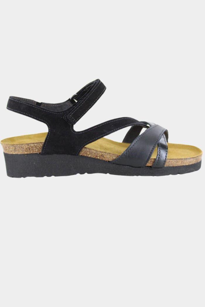 Introducing the Naot Sophia-a stylish sandal featuring contrasting crisscross leather straps for a chic look. Enjoy the perfect fit with a hook and loop strap at the instep for adjustability and a back strap with gore for added stability. Crafted with Naot's anatomic cork & latex footbed wrapped in pampering suede and molds to the shape of your foot with wear, ensuring personalized comfort. Plus, it's accepted by the American Podiatric Medical Association (APMA) for promoting good foot health. .