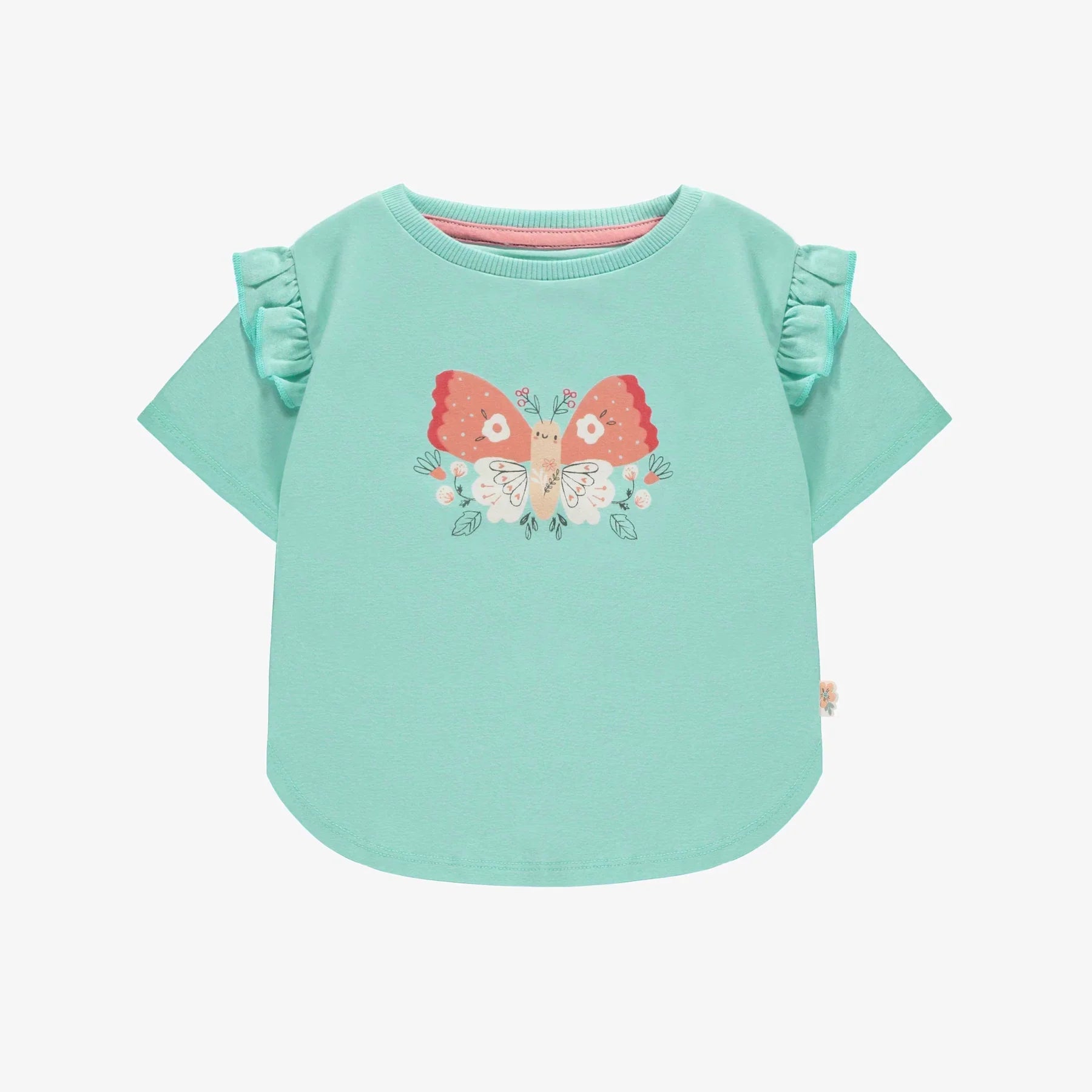 Short-sleeved t-shirt, regular fit, round neck, ruffles at shoulders, rounded bottom, with a printed illustration, 100% cotton.