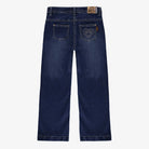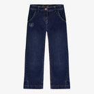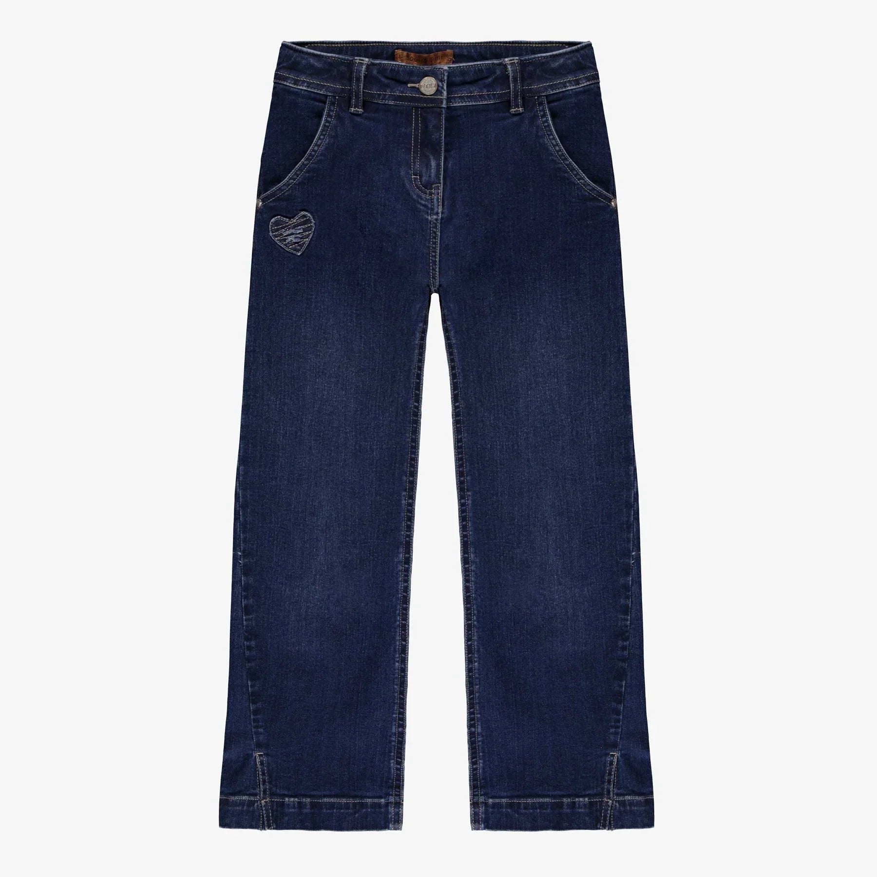 Dark blue regular fit denim pants with slightly flared legs and slits on the bottom front. The seams are visible and it has a beautiful heart embroidery at front and back.