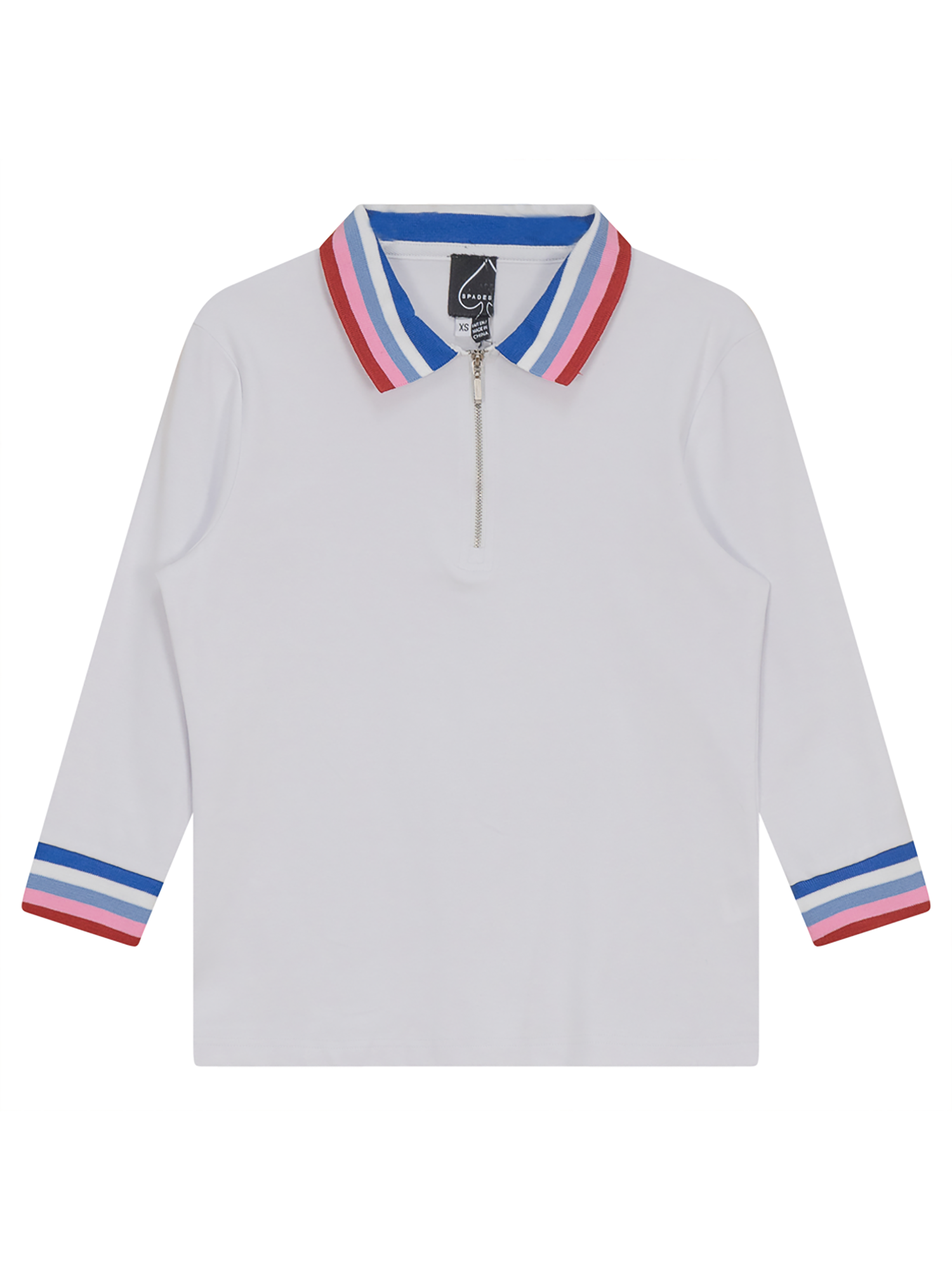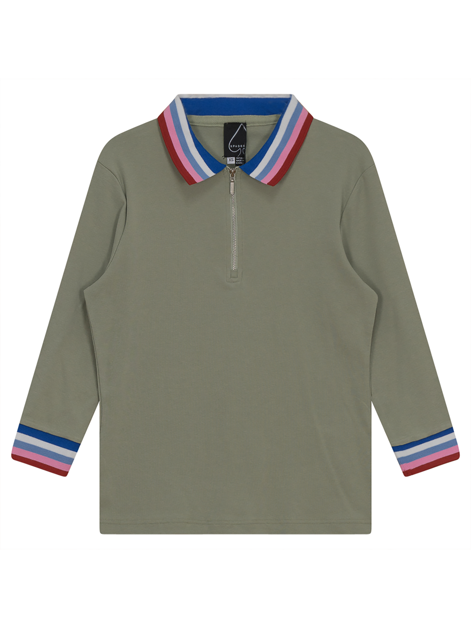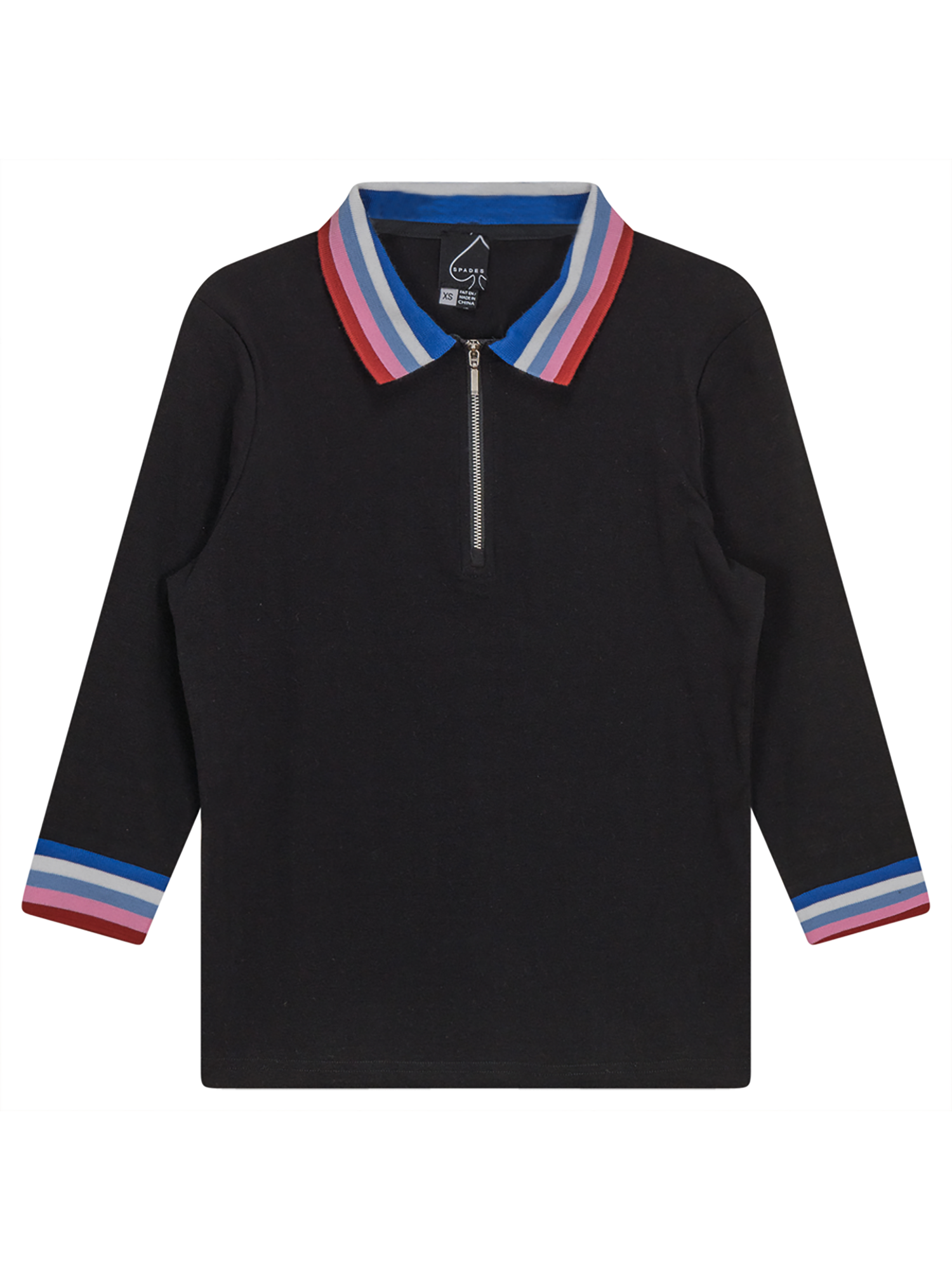 •LOOK: New from Spades is a classic half zip polo. Perfect collar for keeping down or popping up (this one will stay popped). It has three-quarter sleeves that finish with the same pattern as the collar. If left unzipped, a layering piece underneath will show nicely. The fabric is a very soft and smooth stretchy knit. Perfect top for those casual gatherings with friends. Sporty enough to wear to a baseball game or tennis match. Relaxed fit hip length.