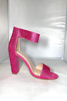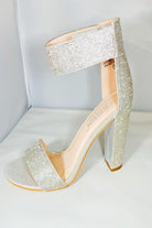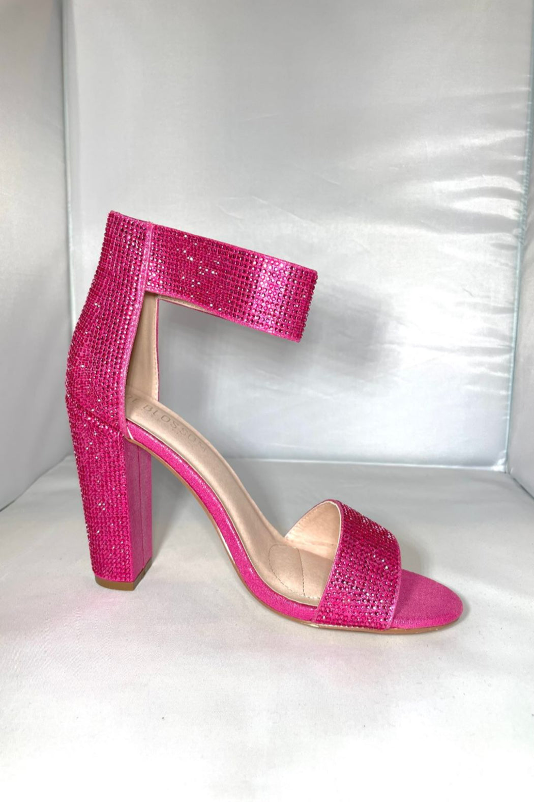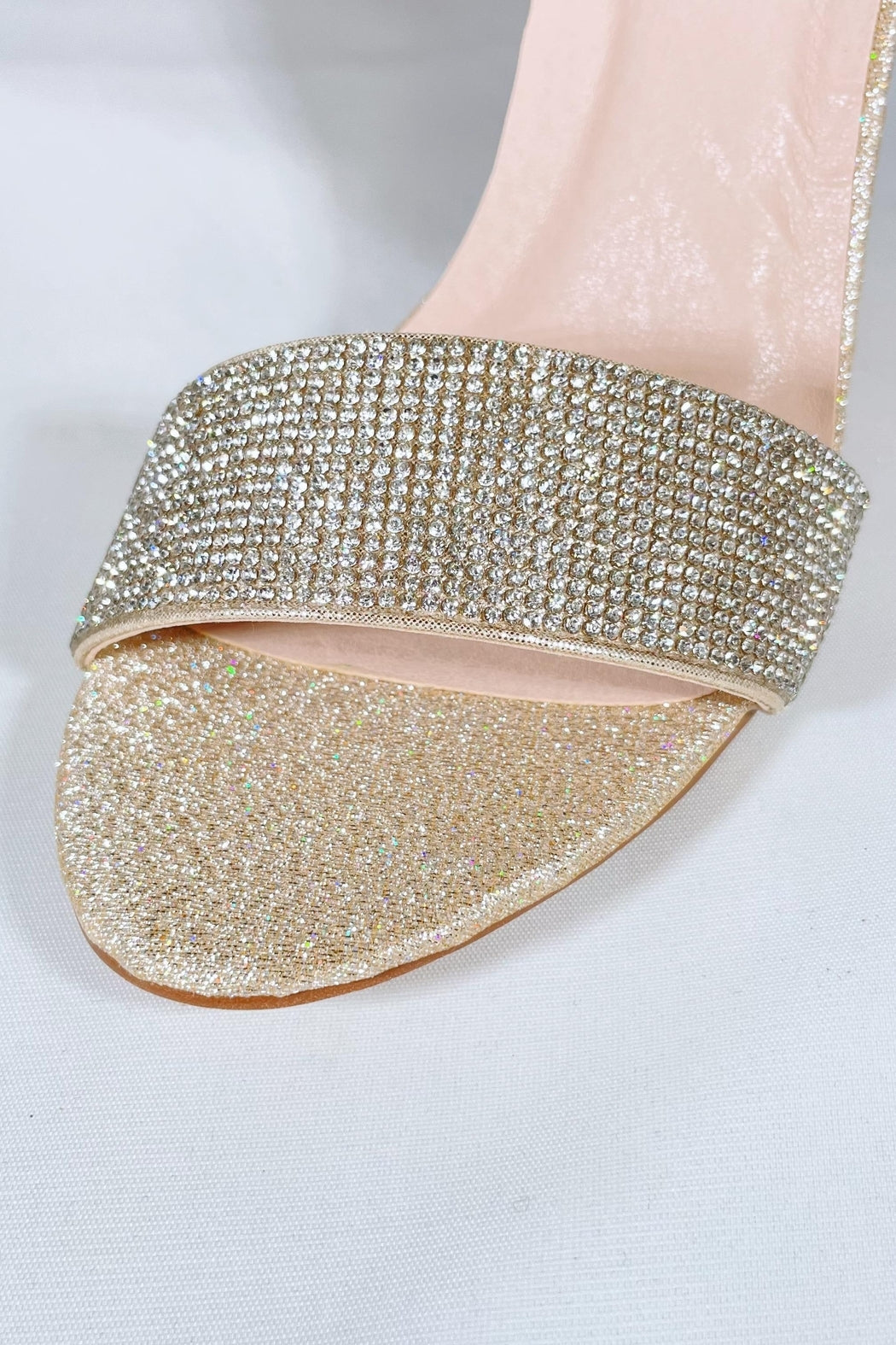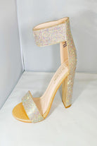 These jeweled heels are absolutely amazing! They are 3.5" heel with velcro straps. They also have a little extra padding in the ball of the foot for all day comfort. The "multicolor" sizes are champagne with clear rhinestones overtop.