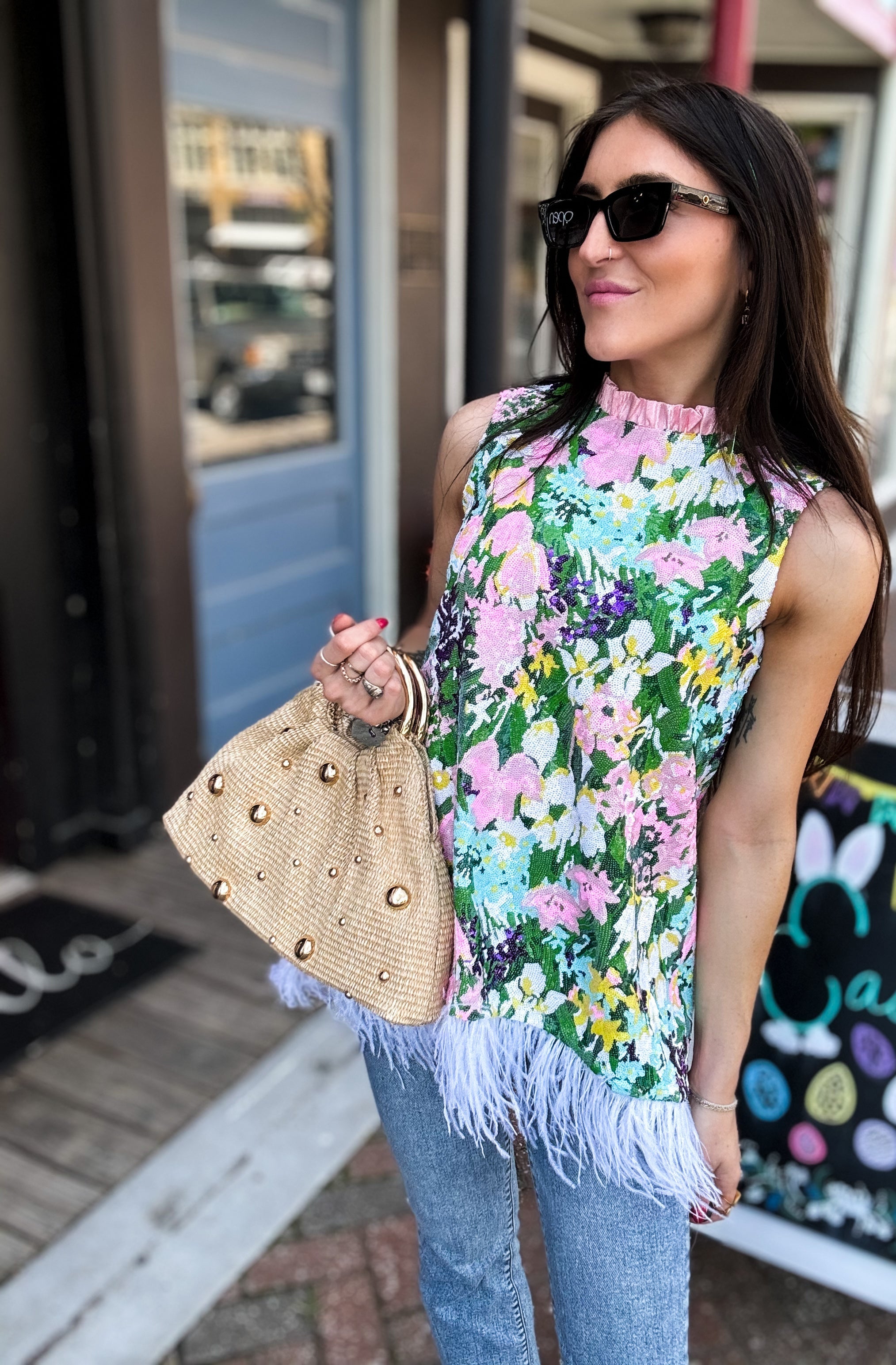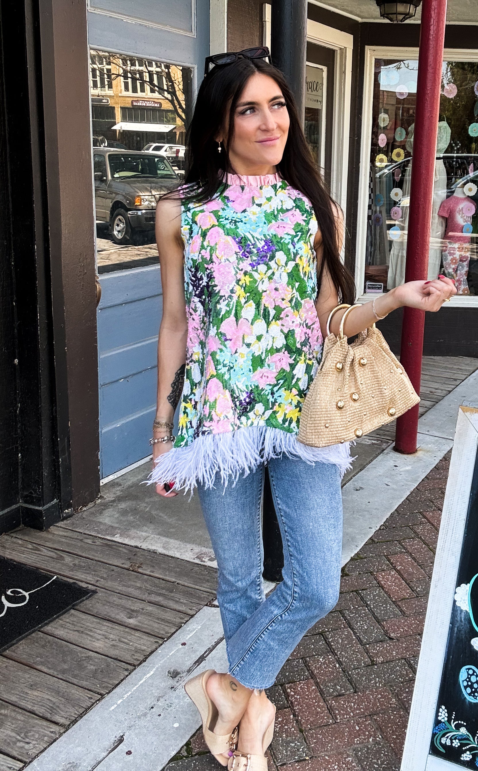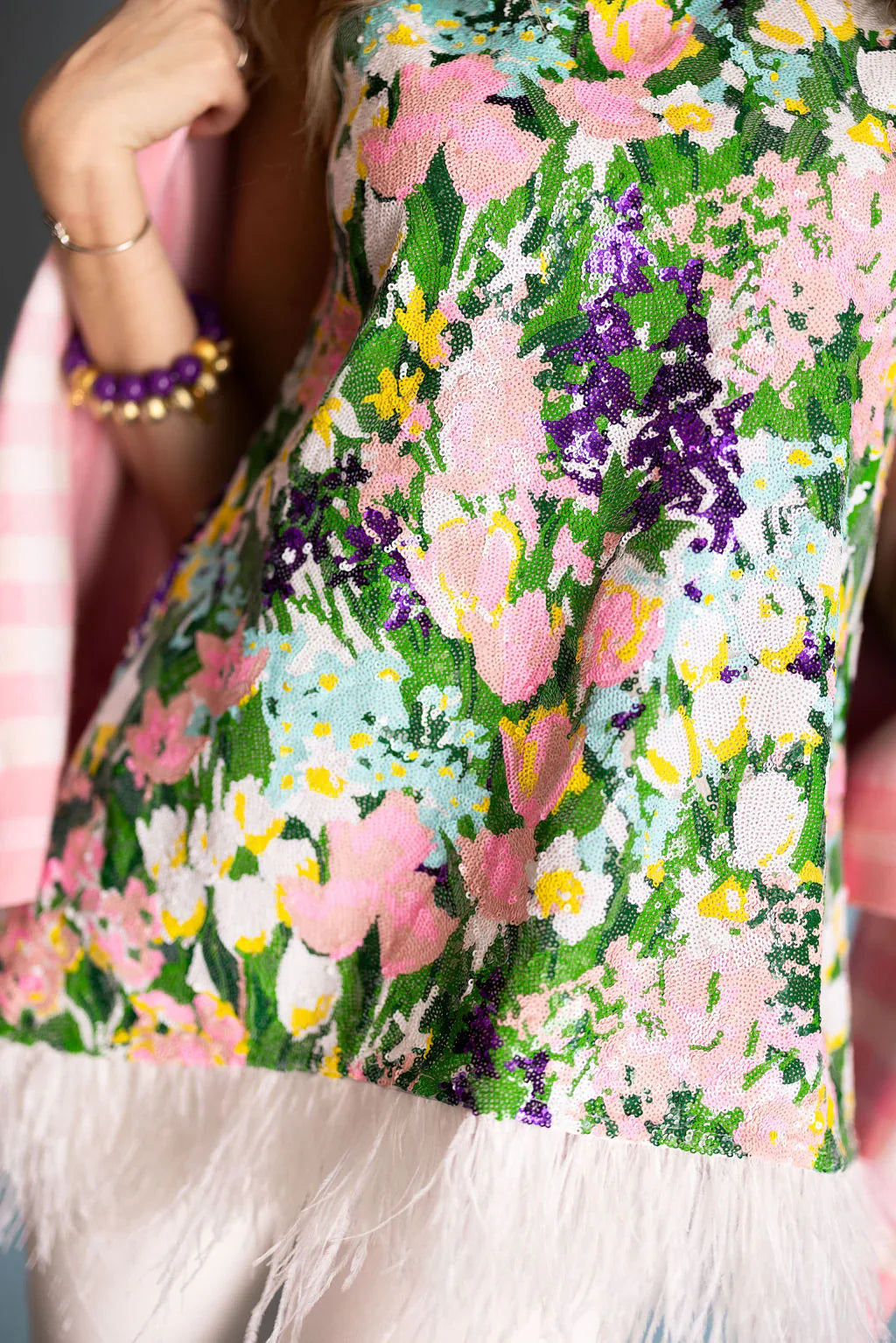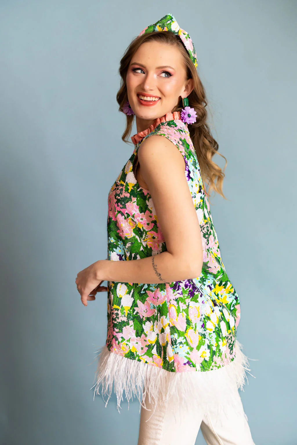 - Our Sparkling Blossoms Tunic is made from full sequin fabric for the most stunning texture and shine, then trimmed with white feathers along the hem for added drama and fun!