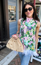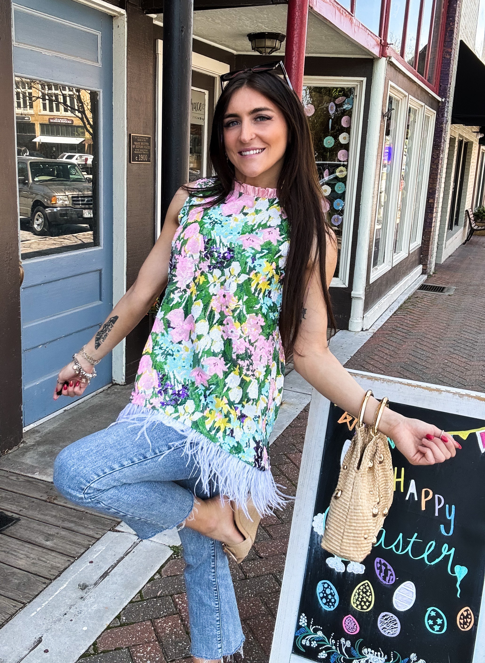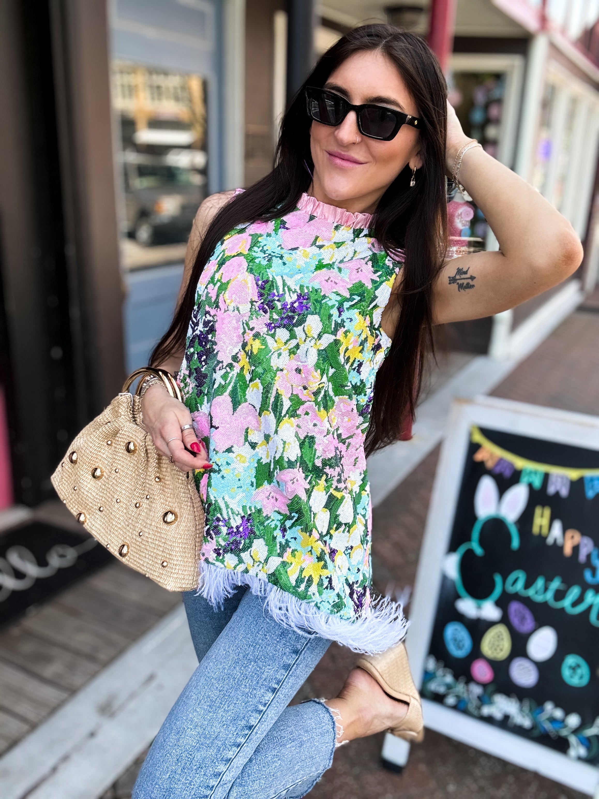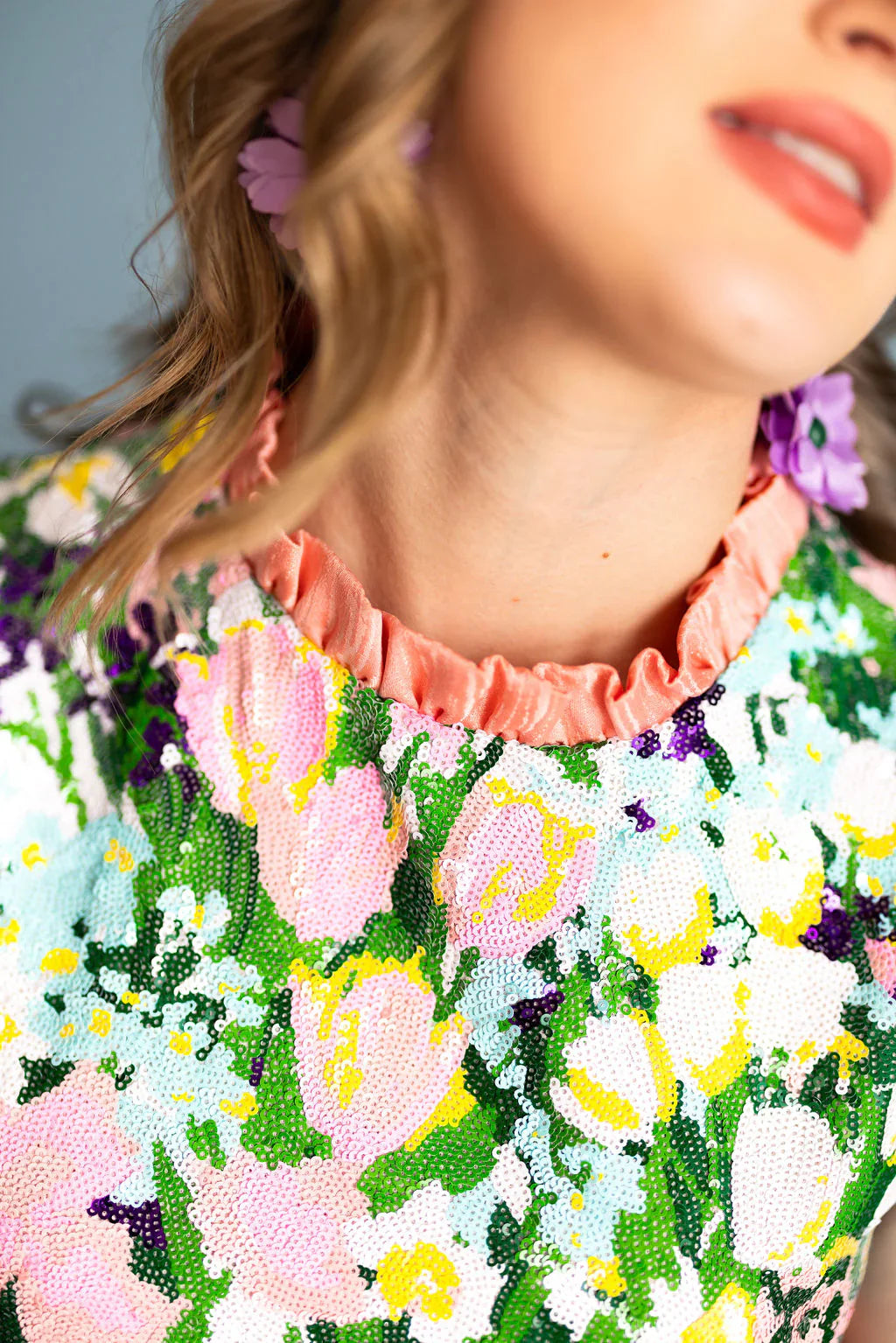 - Our Sparkling Blossoms Tunic is made from full sequin fabric for the most stunning texture and shine, then trimmed with white feathers along the hem for added drama and fun!