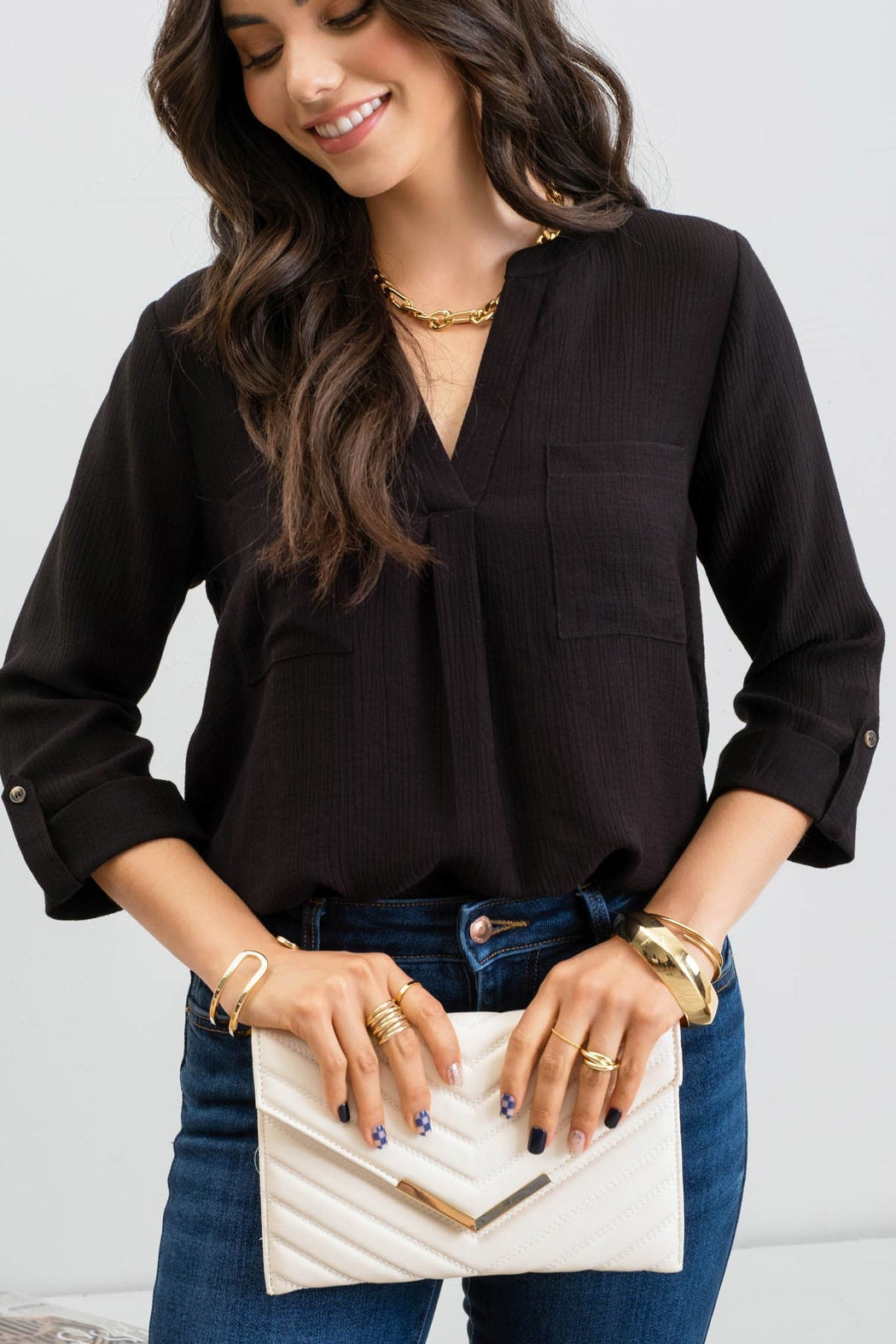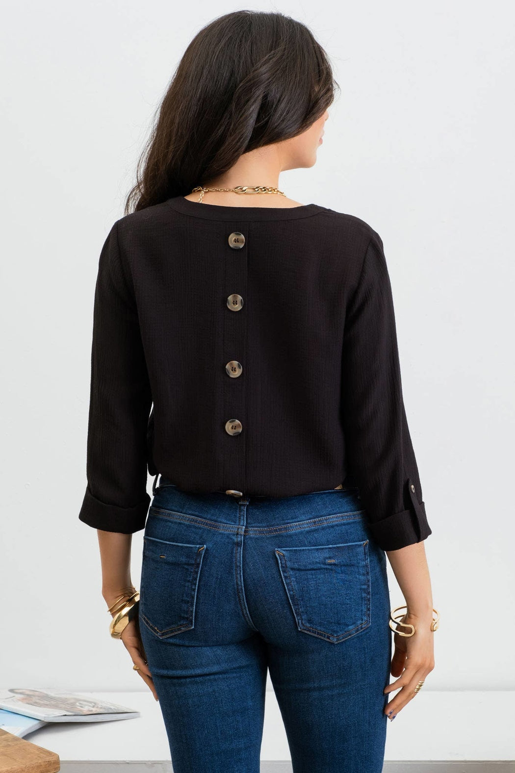 Split Neck Back Button 3/4 Tab Sleeve Top