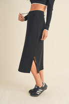 Get ready to turn heads with our Sporty Basic Midi Skirt! Made with lightweight and breathable fabric, this essential skirt is perfect for any occasion. With side slits, an elastic waistband, and adjustable drawstring, you'll be comfortable and stylish all day. (Score!)