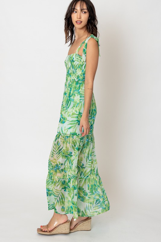 Gathered top, self-tie straps. Sheer fabric, lined to the knee.