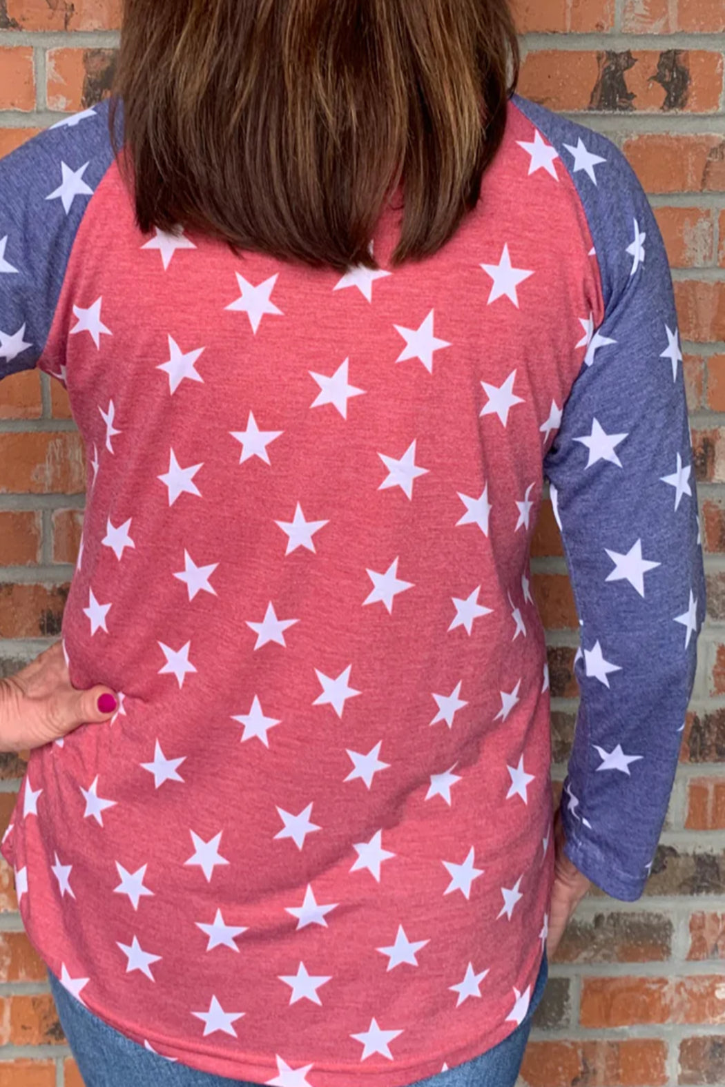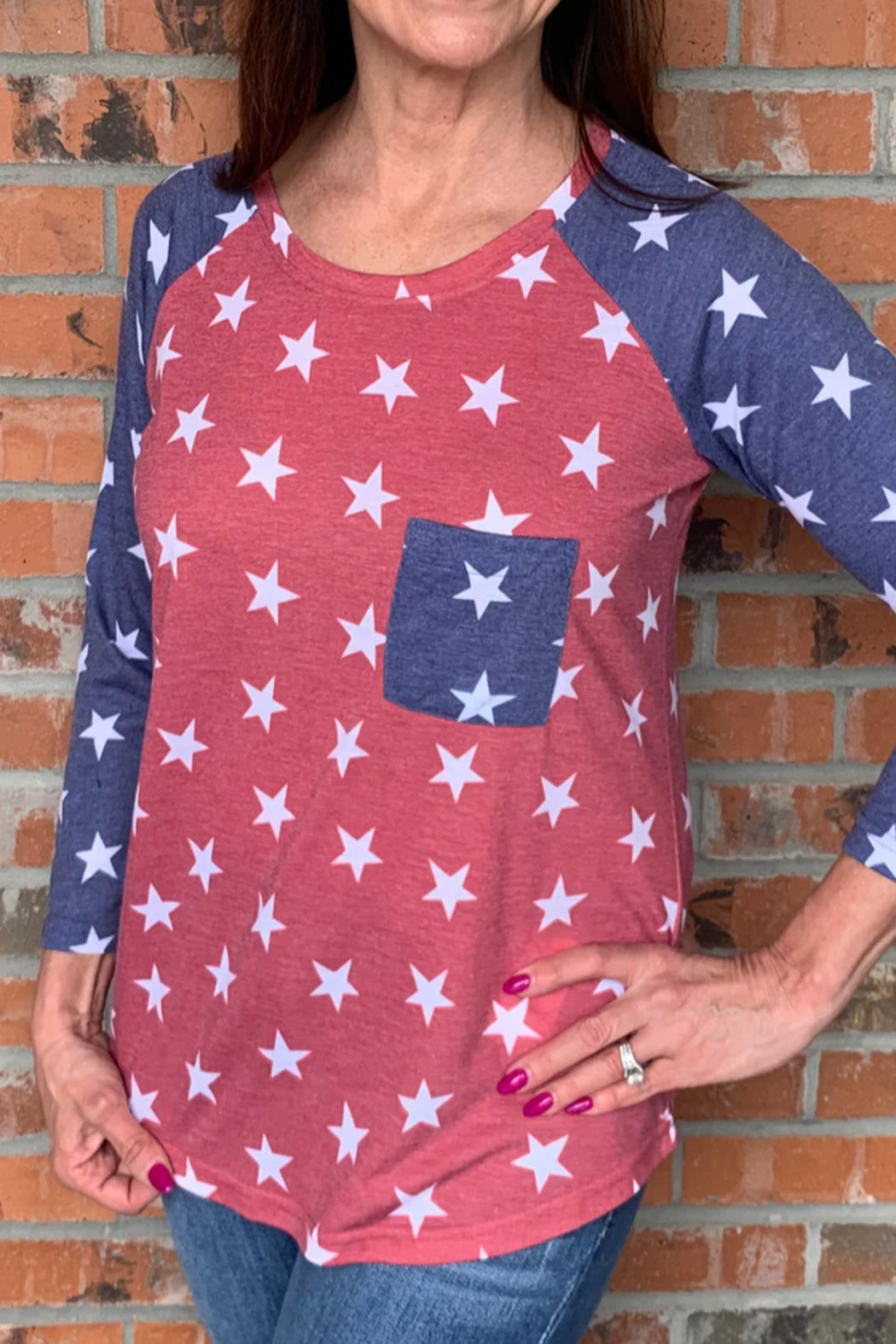 This stars baseball tee features a front pocket, crew neckline, rounded hemline and 3/4 sleeves.