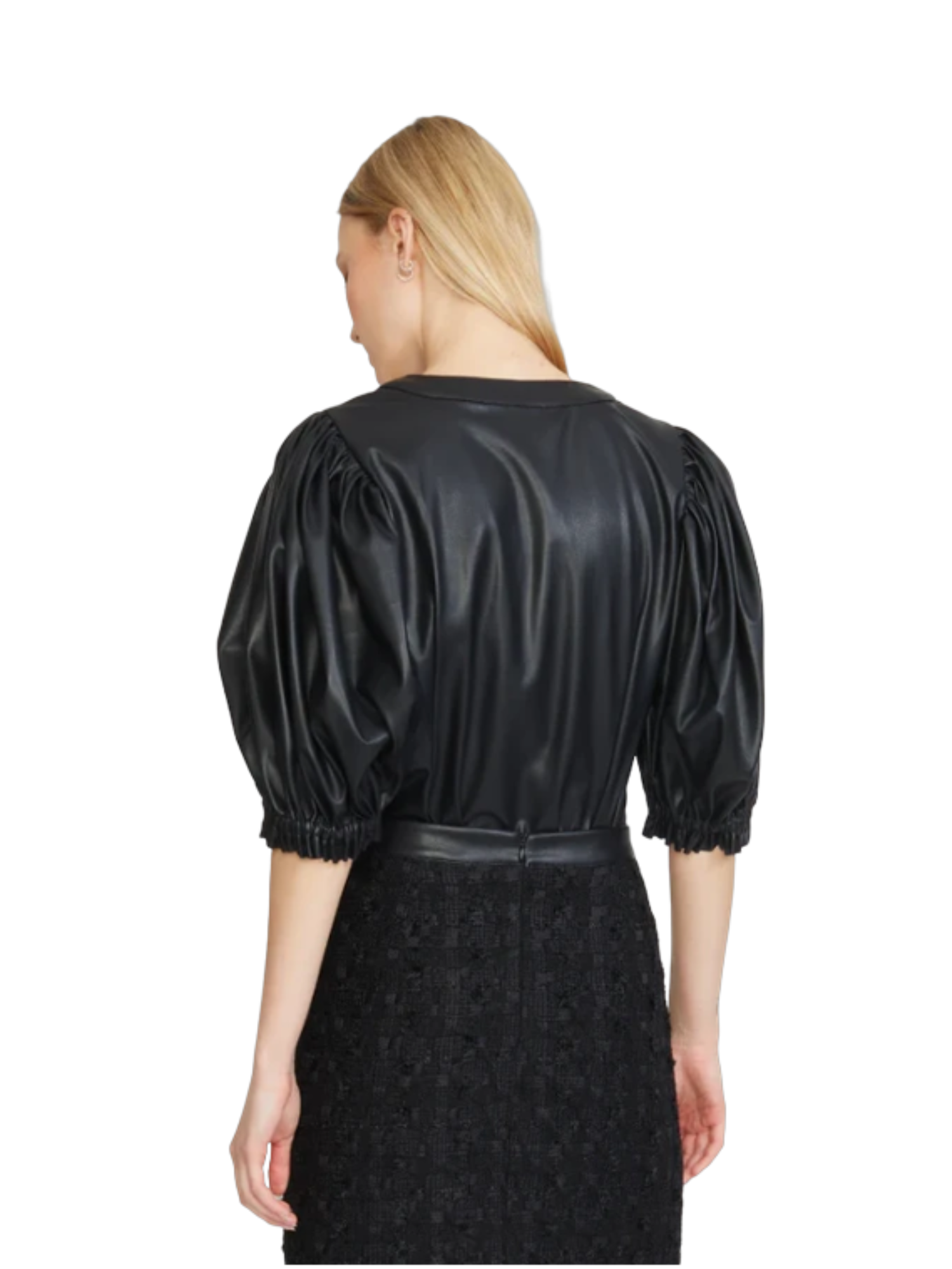 Look: Elevate your style with the Stellah Vegan Leather Balloon Sleeve Top. Crafted from premium vegan leather, this chic top features dramatic balloon sleeves and a flattering silhouette that exudes confidence. Perfect for any occasion, it combines edgy sophistication with sustainable fashion, making it a must-have addition to your wardrobe.
