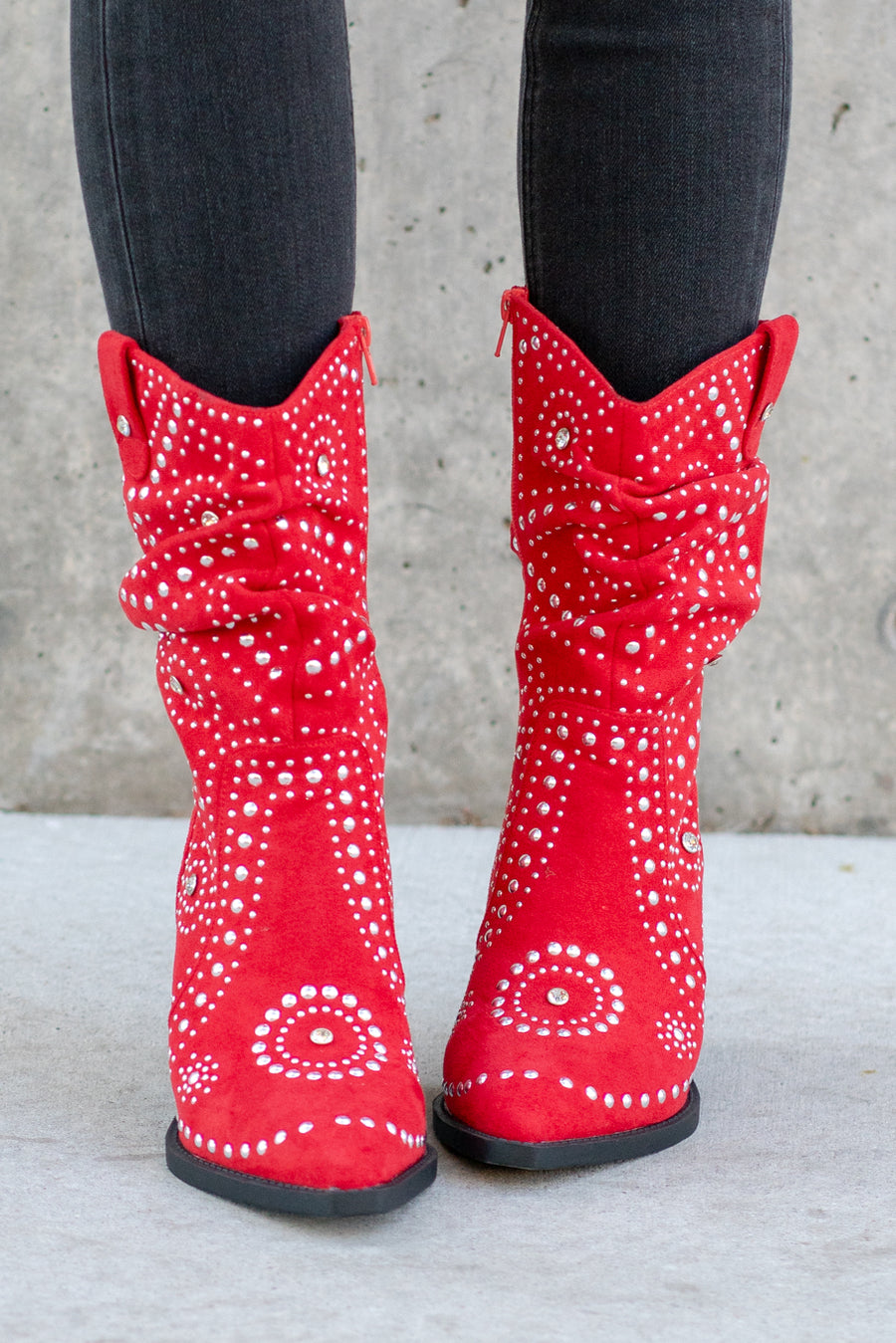 OMG! These boots are the HOLY GRAIL of the season! If there's one thing Ariel from Footloose taught us, it's that EVERY girl needs a great pair of RED BOOTS! You'll love the slouchy look, all the glittering rhinestones, the pointy toe, and the very doable 2" heel! Don't let these pass you by!