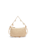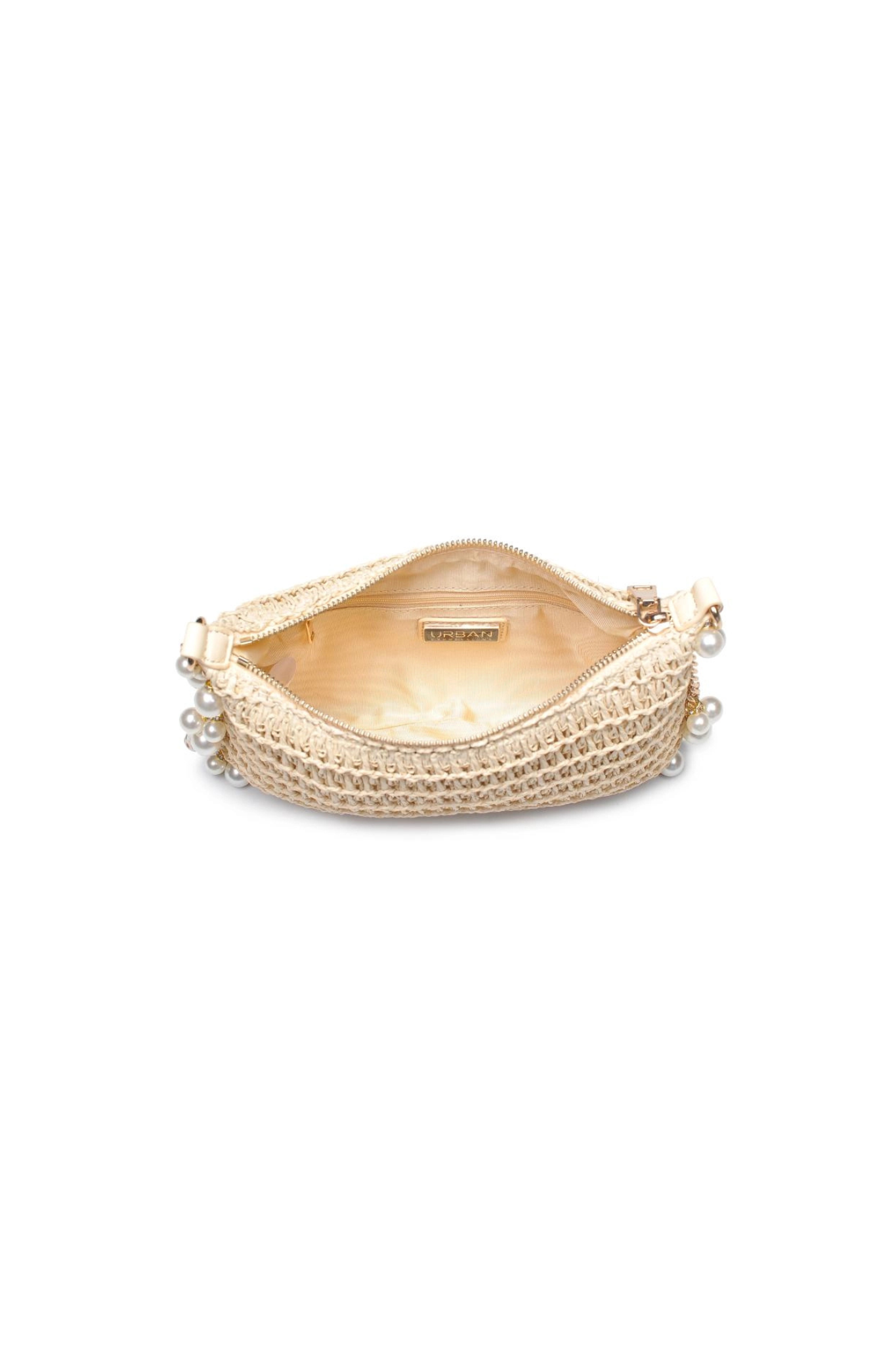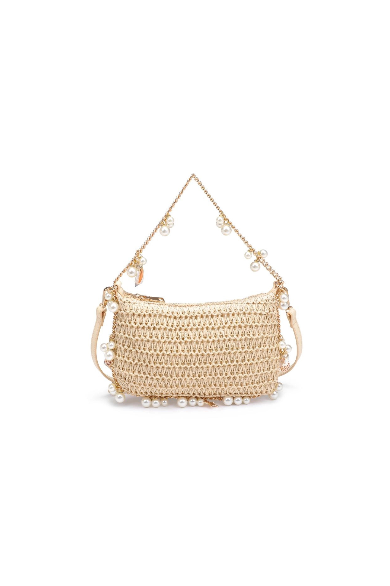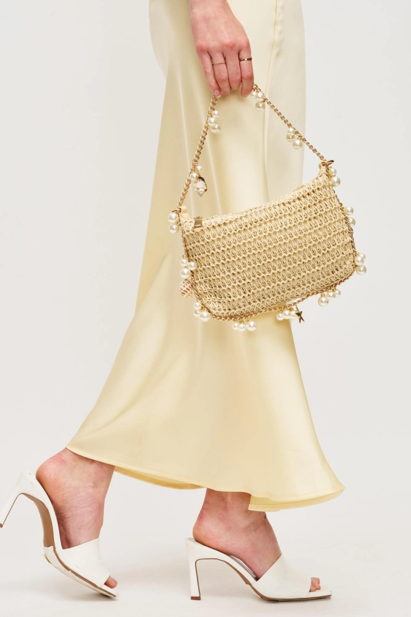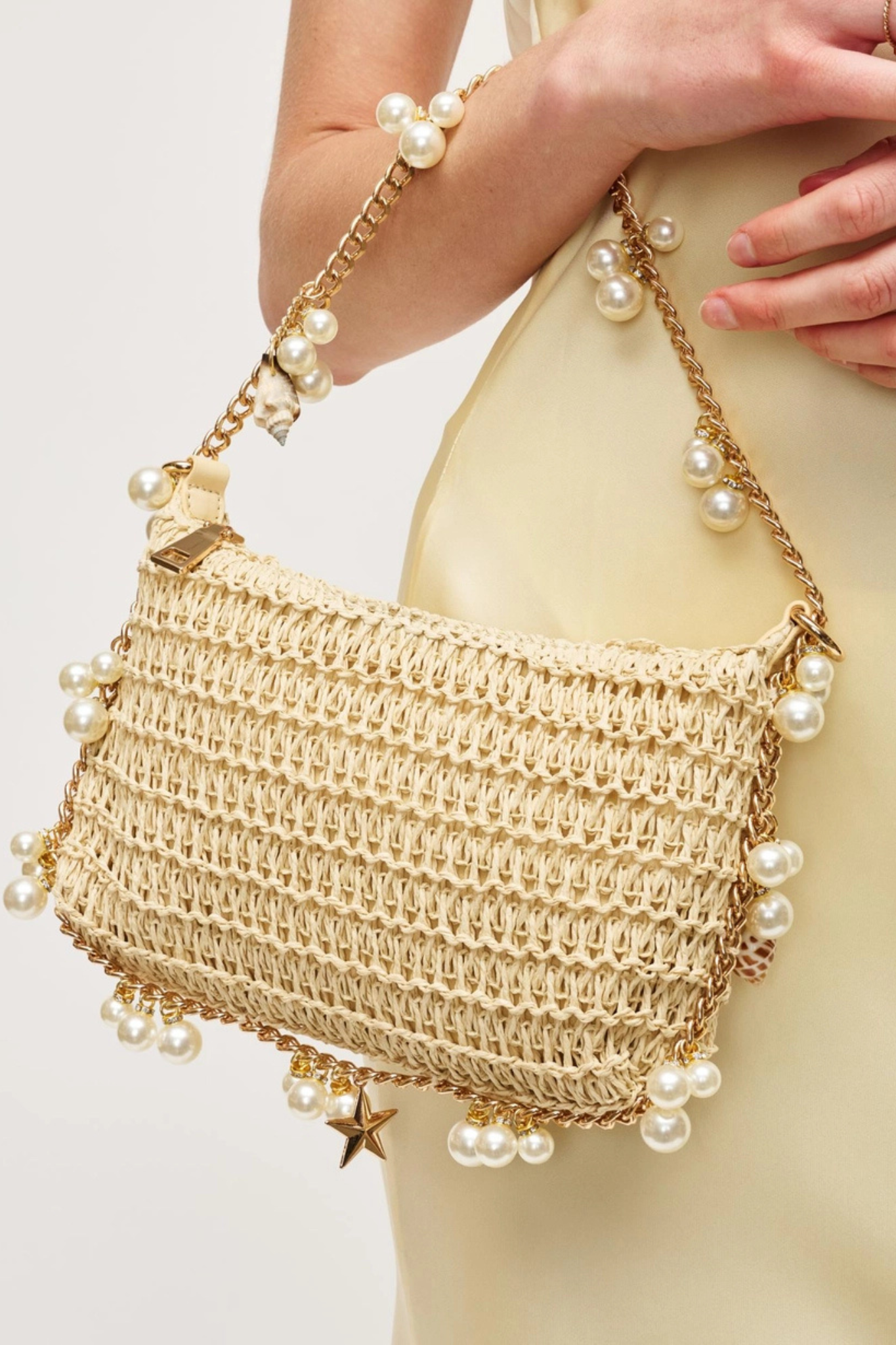 - Exterior Details: Woven Design, Gold Hardware, Pearl Embellishments