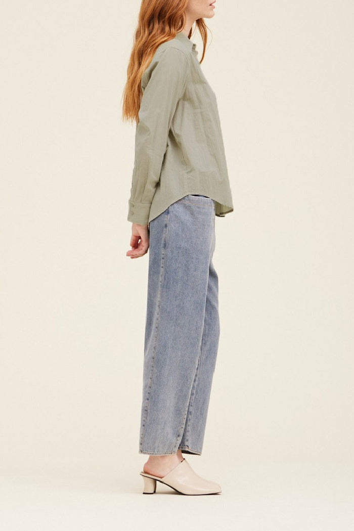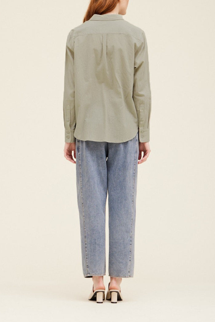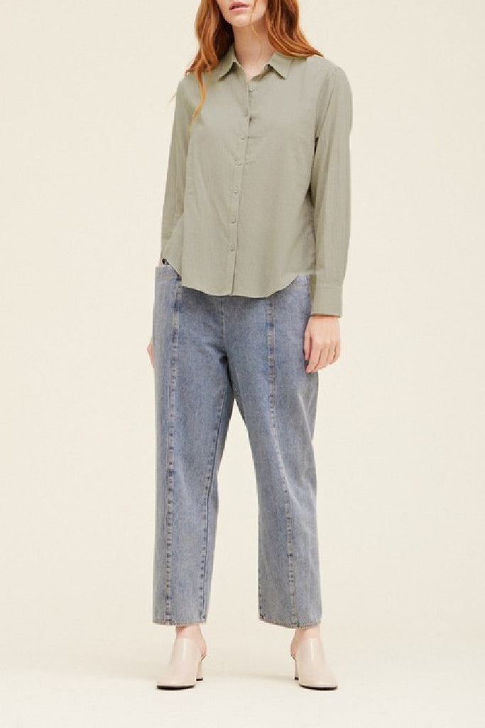 Classic, crinkle fabric blouse with shirt collar. Rounded hem. Perfect blouse to create a fun work outfit or dress it down and wear it open front with a great tank & pair of jeans. 100% Cotton. Model is wearing a size small. Refer to measurements for your perfect fit. Across chest measurements; Small 21”, Medium 22”, Large 23". Shoulder to front front hem; Small 25”, Medium 25.5”, Large 26".