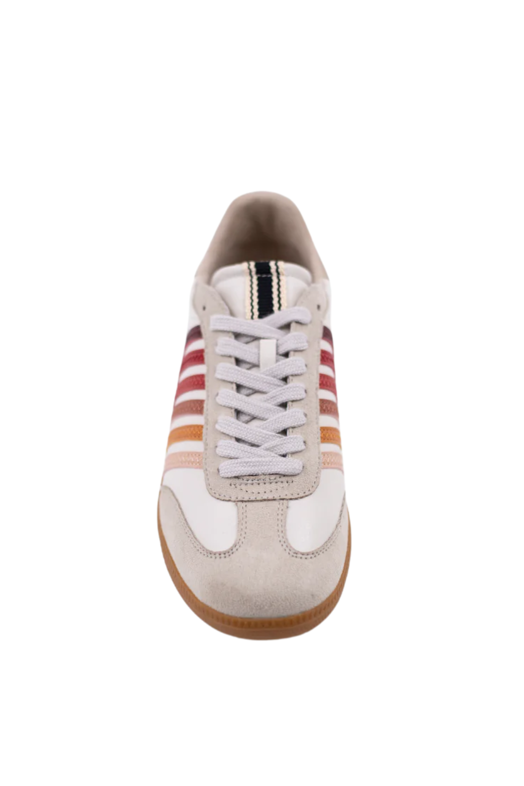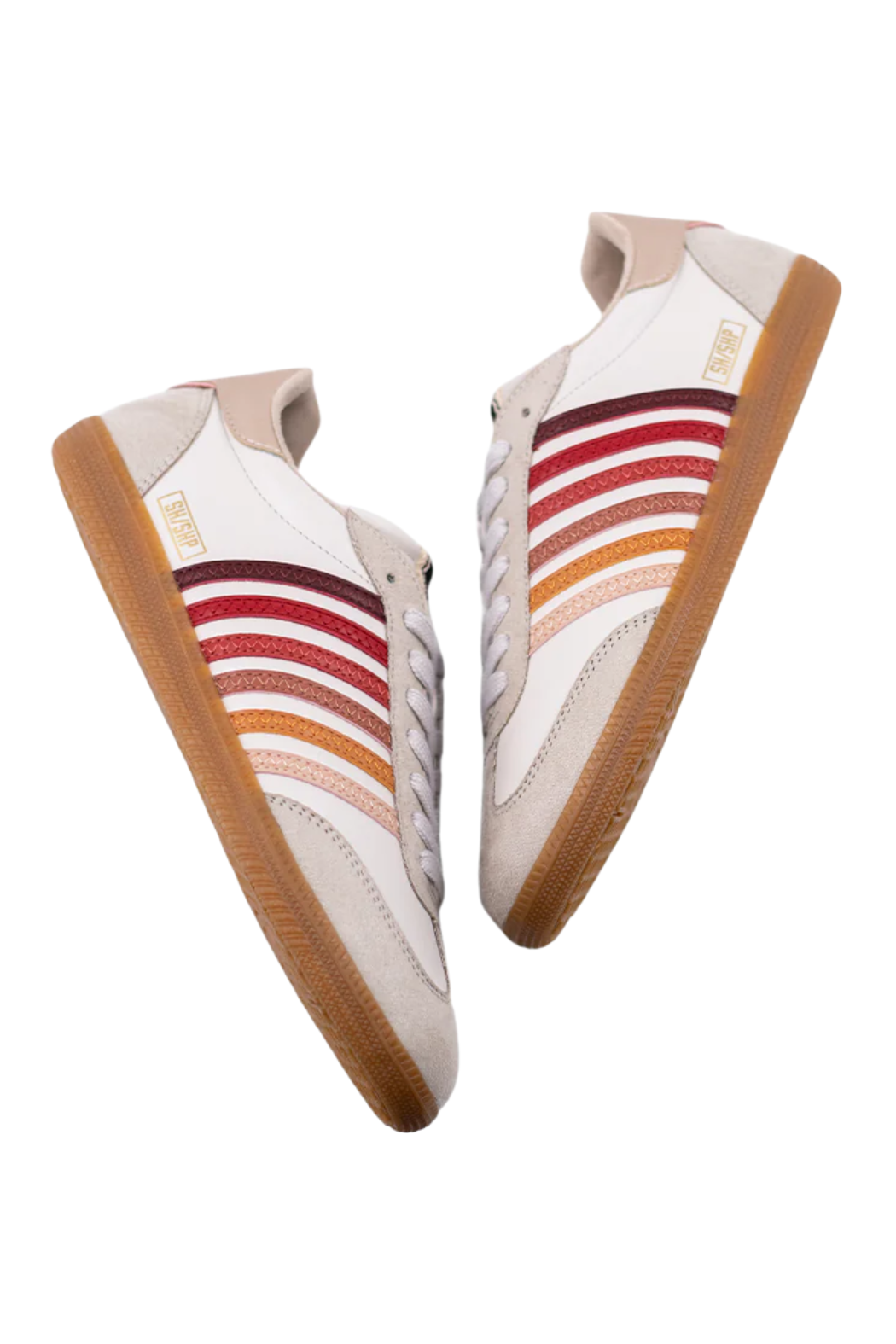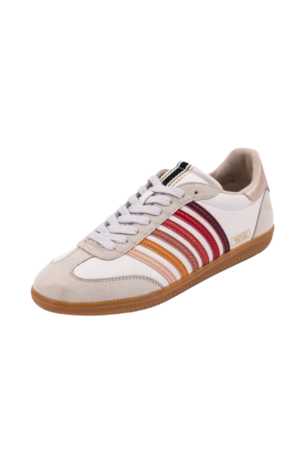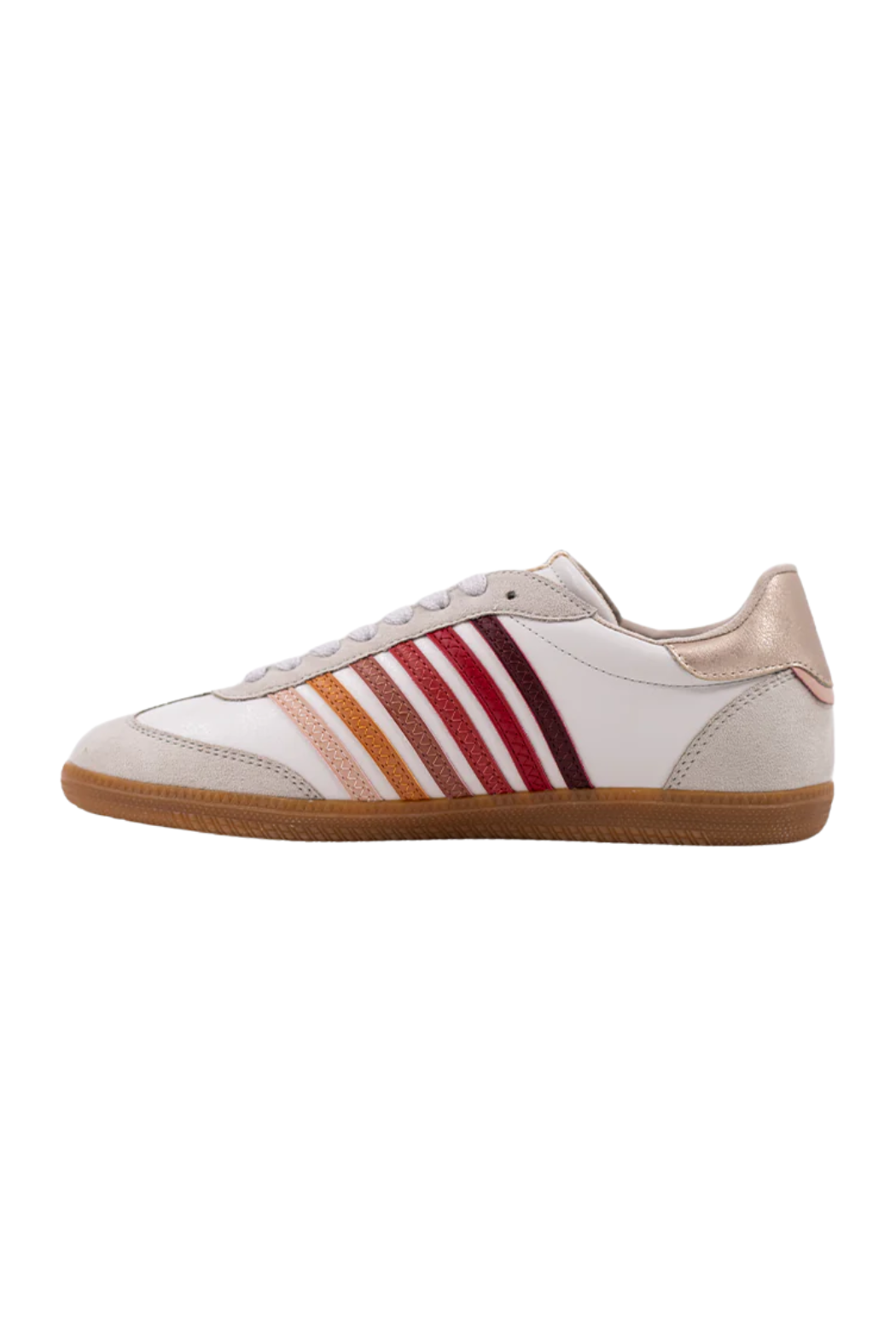 The STEVIE in Red Multi combines vintage charm with a modern twist. It features a sleek faux leather body, rich suede accents, and bold textured stripes in red and gold. The metallic gold heel and gum sole enhance the design, providing a sporty yet stylish elevation. This statement sneaker is a must-have for your wardrobe.