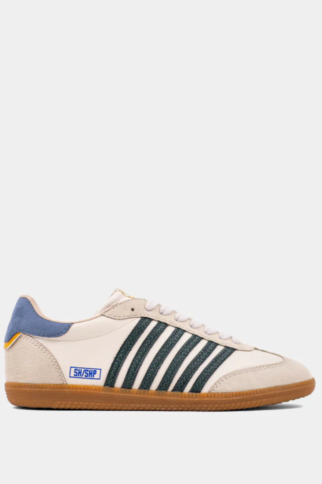 Meet the Stevie sneaker in dark green - where vintage charm meets bold design. Featuring deep green textured stripes, soft beige suede overlays, and a striking blue heel tab with a yellow accent, this sneaker is all about standout details. Made with premium faux leather and a durable gum sole, it's the perfect blend of retro style and everyday versatility.
