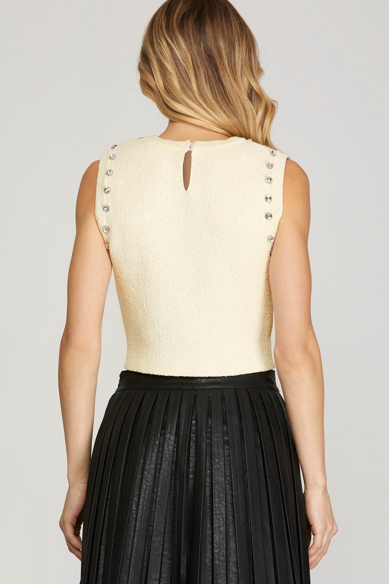 SLEEVELESS RHINESTONE SWEATER CROP TOP
