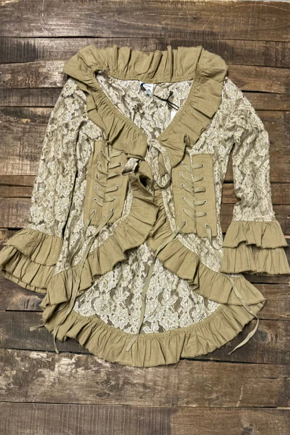 Introducing the Stockton Swoon with Grace Jacket, the epitome of unique gypsy style. This vintage lace jacket with corset details in the front and back exudes Victorian charm. The ruffle hems throughout add a touch of whimsy to this jacket that will make you stand out from the crowd.