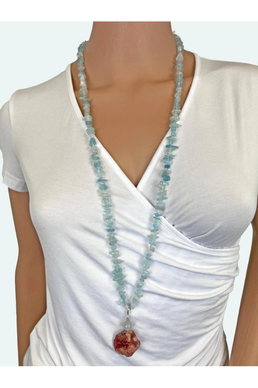 Major Bead/Material: Petite free-form aquamarine, detachable geo free-form strawberry quartz pendant, aquamarine round bead.