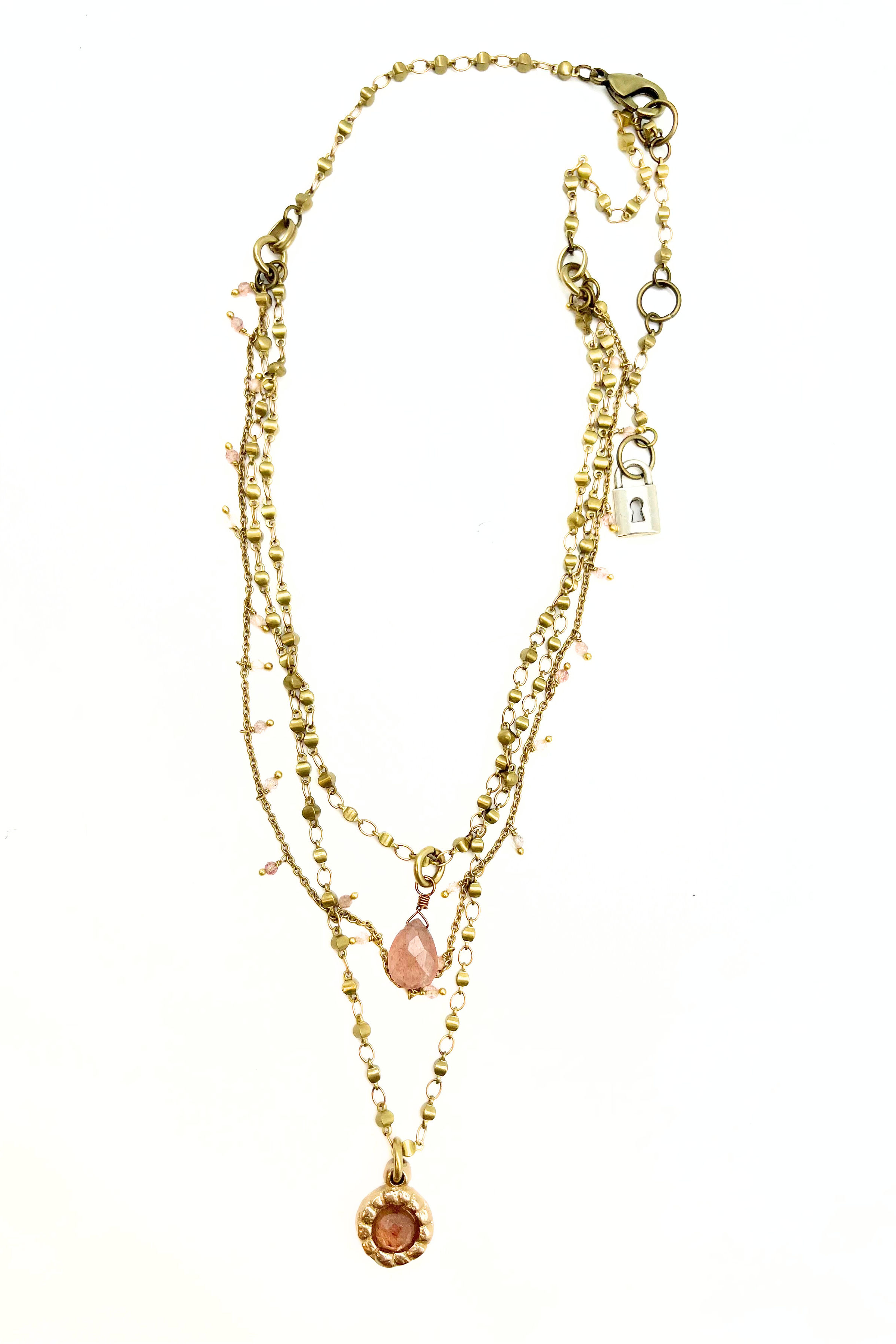This delicate triple-layered necklace is preset with a pendant drop on a beaded rosary chain, and a brass rosary chain with a bronze pendant drop. The shortest chain is 16.5". This piece is inspired by Anna Pavlova - THE prima ballerina of the beginning of the 20th century. Classical ballet did not come easy to her but she overcame the setback and, after dancing with the Imperial Ballet, formed her own company. As she is quoted saying, “No one can arrive from being talented alone. God gives talent, work transforms talent into genius." 16" in length.