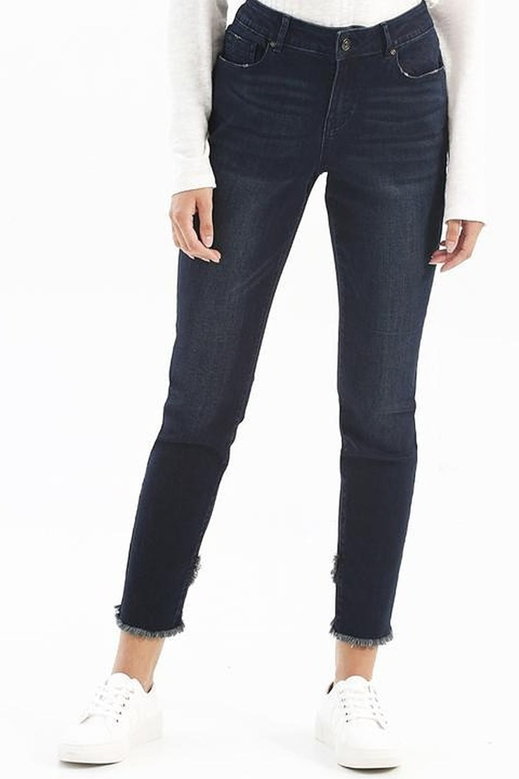 These 5 pocket jeans from Charlie B feature a stretchy slim-fit and released crossover hem. Comfy, stretchy, perfect! Your go-to denim.