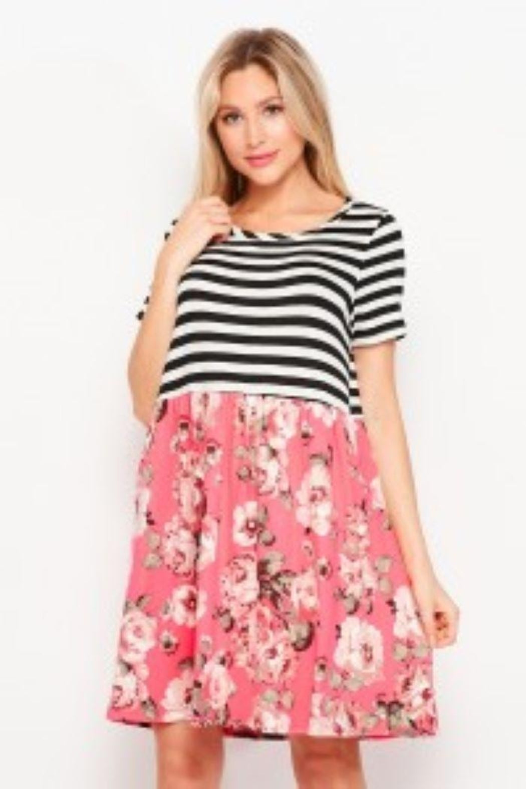 This dress is perfect for summer! The fun stripes on the top and the neon floral on the bottom is absolutely adorable. This dress also has POCKETS! It is a nice fabric that will keep you cool in the hot months.