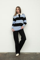 Stay stylish and cozy in this chic striped sweater, featuring a classic collar and button detail. The soft blue and black tones make it perfect for layering or wearing solo!