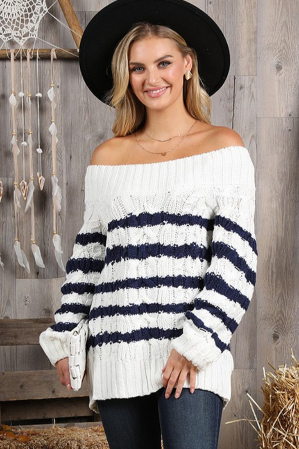 This Soft Cable Knit Sweater with Stripe Pattern Can Be Worn Off Shoulder Or Slouchy One Shoulder. This Tunic Length Sweater Is Perfect To Wear With Your Favorite Jeans Or Leggings