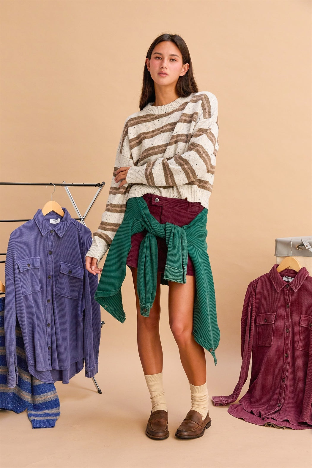 This sweater exudes a relaxed silhouette marked by horizontal stripe detailing, perfect for versatile styling. Its soft texture ensures comfort, making it ideal for layering during cooler months. Style with denim for a casual outing or pair with tailored trousers for a refined yet cozy ensemble.