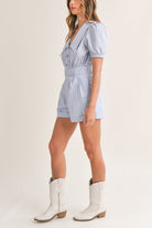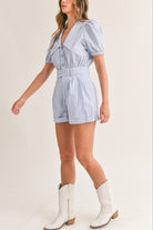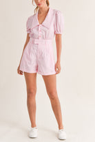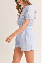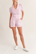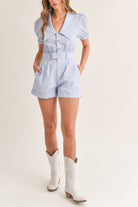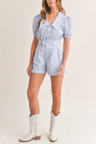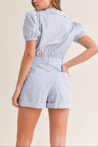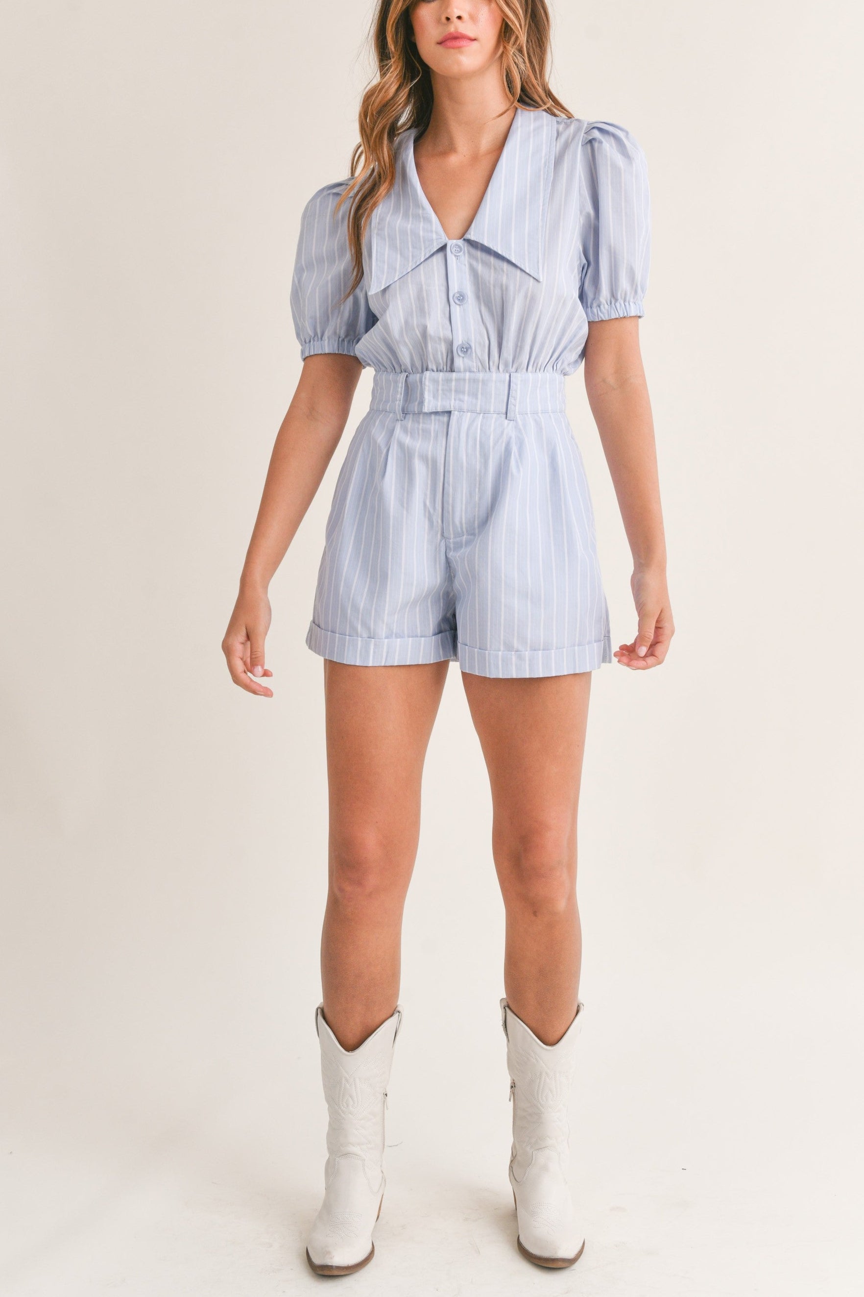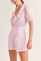 Get ready to turn heads in this playful and stylish Striped Cute Collared Romper! Made from 100% cotton poplin, this romper features short puff sleeves, a sharp collar, and a short lining for added comfort. Perfect for any occasion!