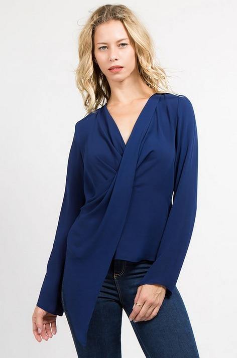 The Adeline asymmetric tucked and draped long sleeve top. Cut in Georgette for beautiful movement.