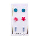 The Lollipop trio has a Turquoise round, Neon Pink Sprinkles flower, and Baby Blue bar.