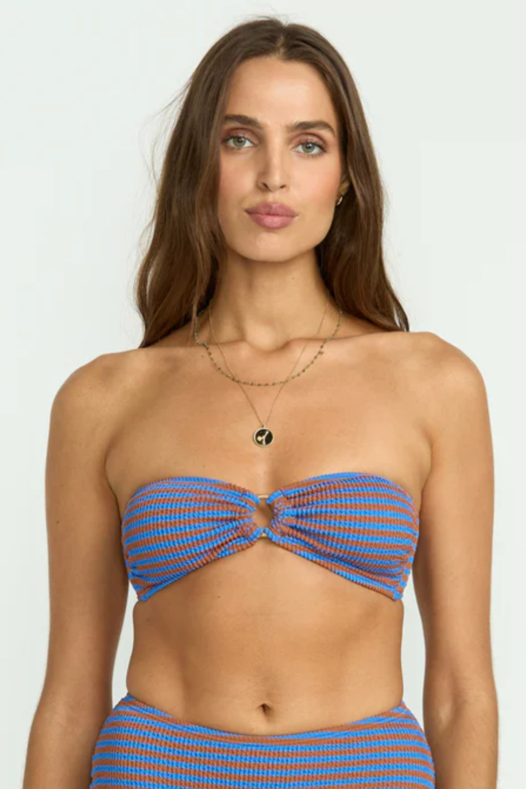 Summer High Stripe Rio Bandeau Bikini Top is a strapless stunner made for sun-drenched days. With its bandeau silhouette, circle ring at center front, and stripe design, it brings retro-cool energy to your swim wardrobe — no straps, no fuss, all glow.