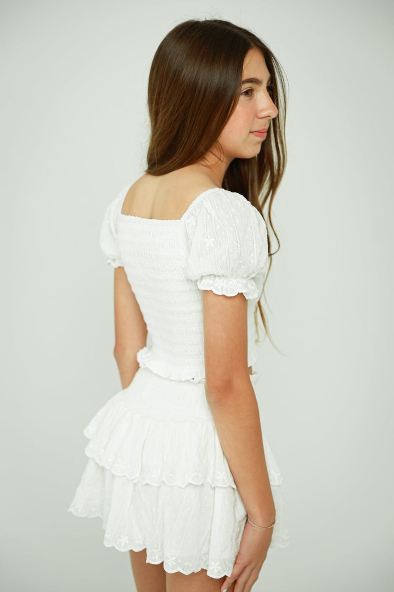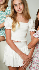 Step into spring in the Eden Set. Its scalloped skirt, adorned with embroidered flowers, pairs effortlessly with a smocked top for a charming ensemble. The ruffle skirt adds a touch of whimsy, making it perfect for any sunny day adventure.